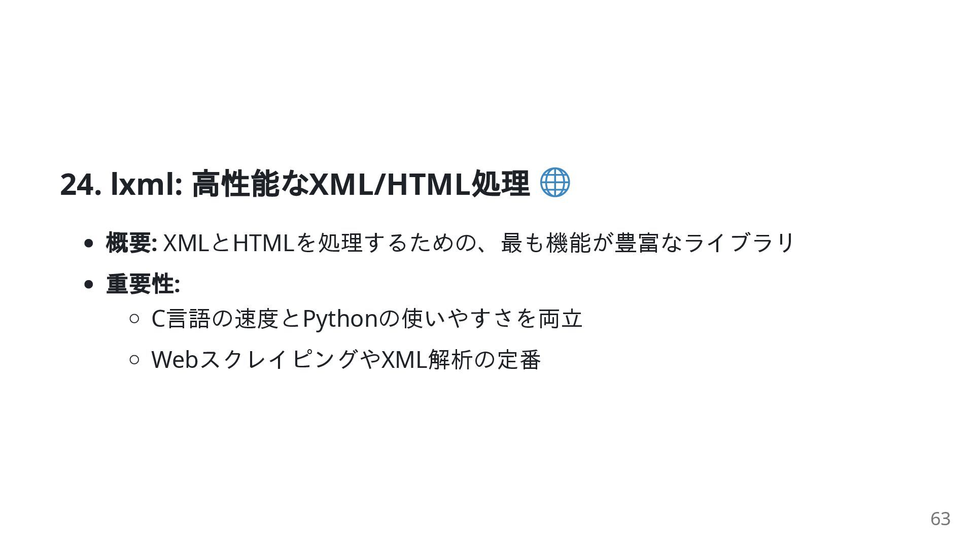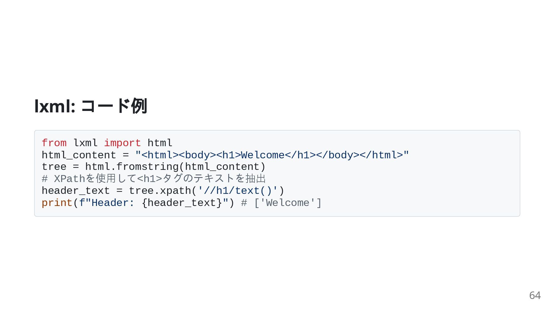 = html.fromstring(html_content) # XPathを使用して<h1>タグのテキストを抽出 header_text = tree.xpath('//h1/text()') print(f"Header: {header_text}") # ['Welcome'] 64