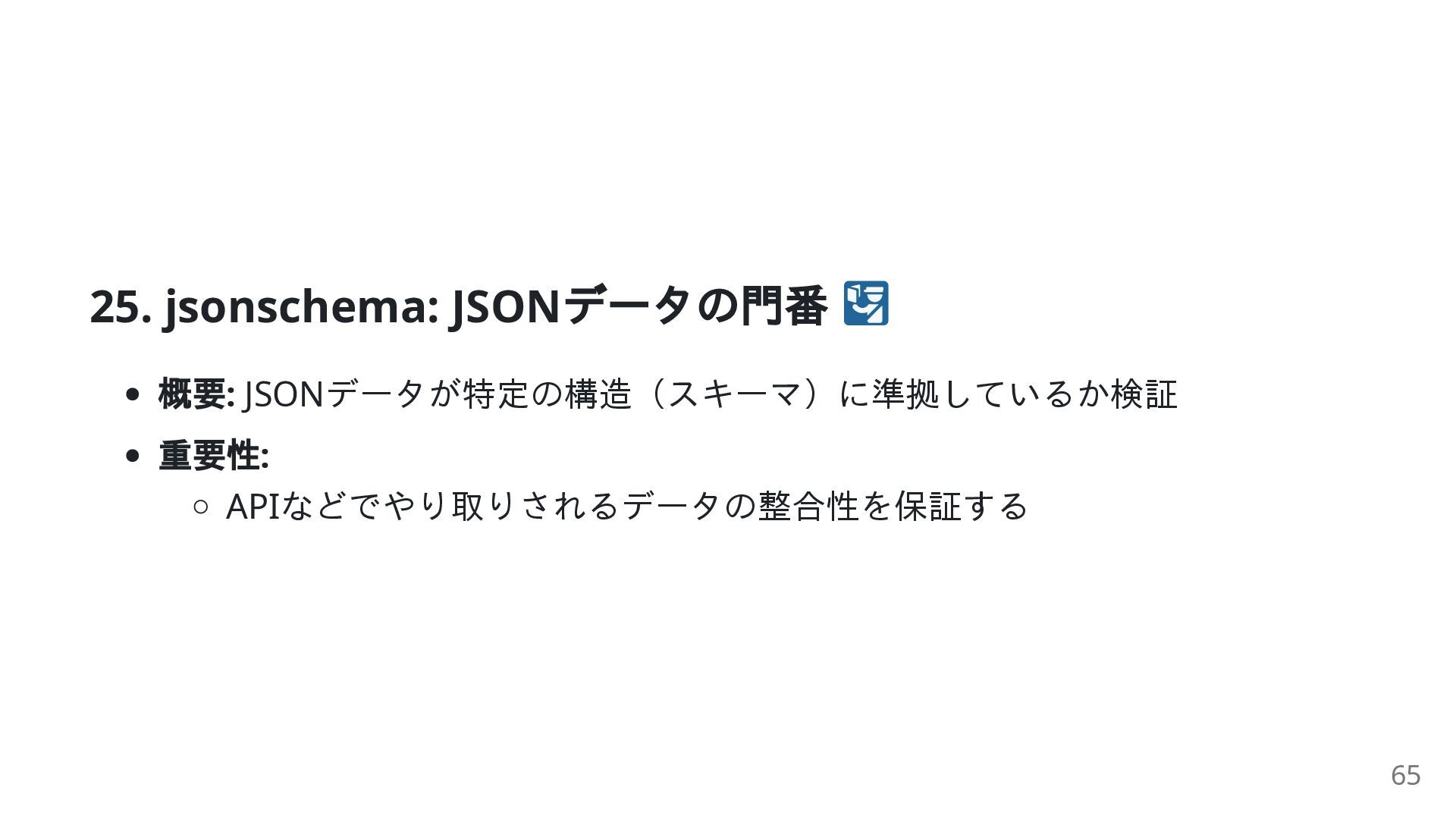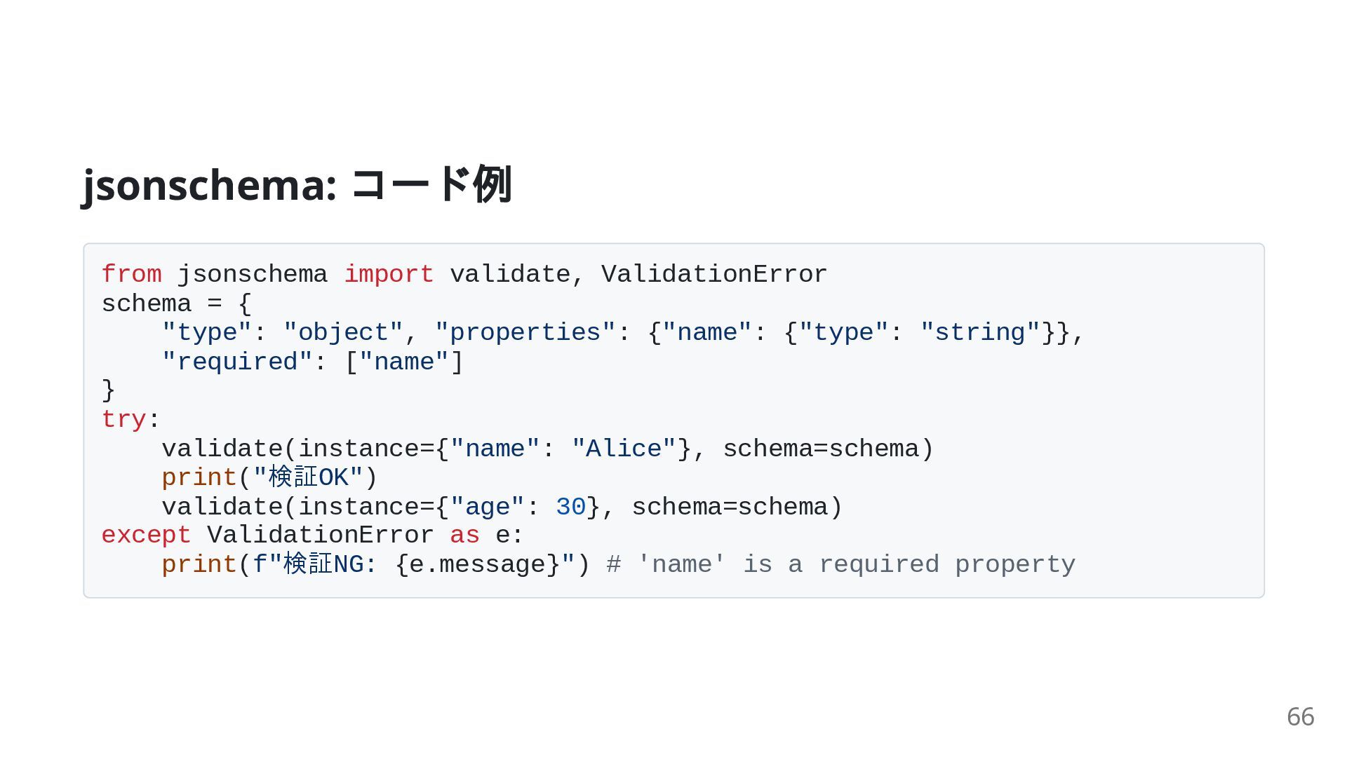 "type": "object", "properties": {"name": {"type": "string"}}, "required": ["name"] } try: validate(instance={"name": "Alice"}, schema=schema) print("検証OK") validate(instance={"age": 30}, schema=schema) except ValidationError as e: print(f"検証NG: {e.message}") # 'name' is a required property 66