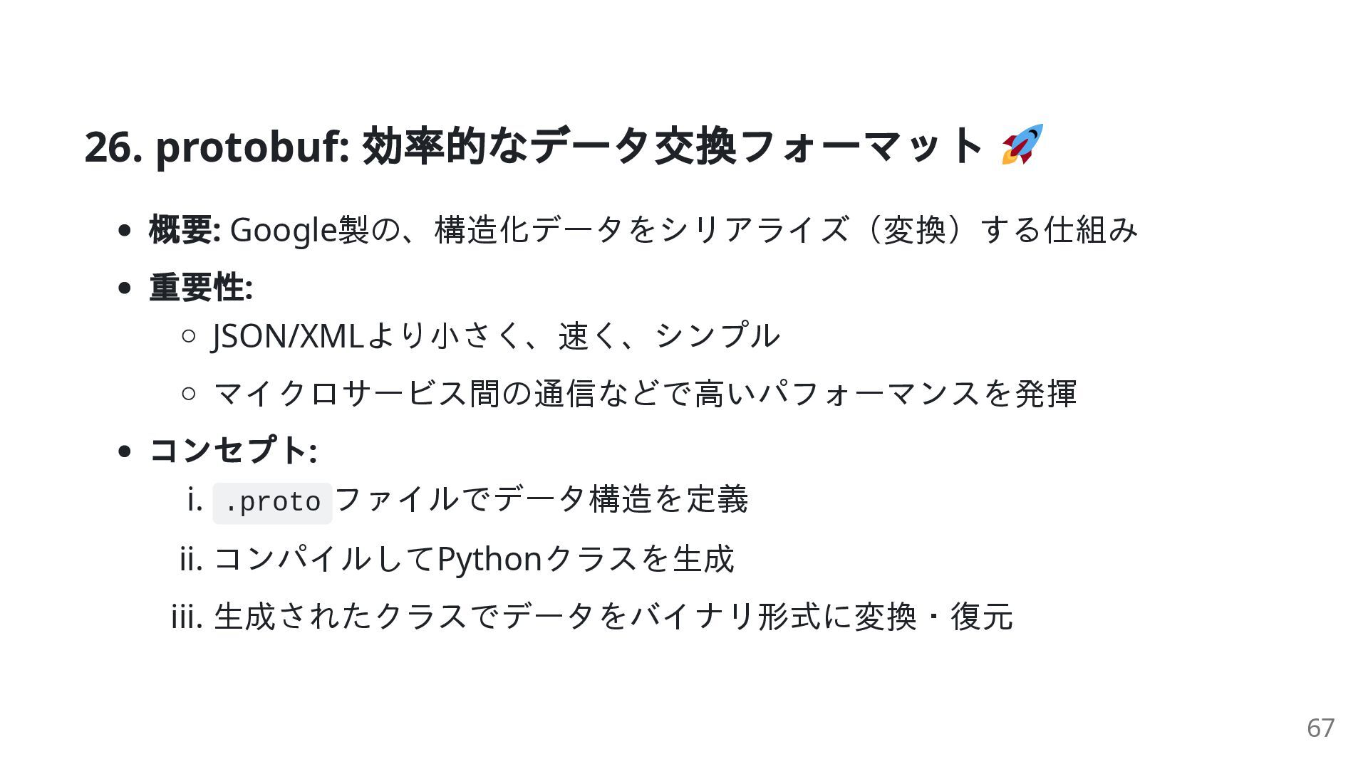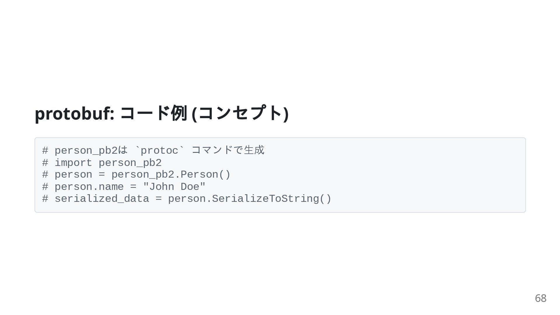 42. protobuf: コード例 ( コンセプト) # person_pb2は `protoc` コマンドで生成 # import