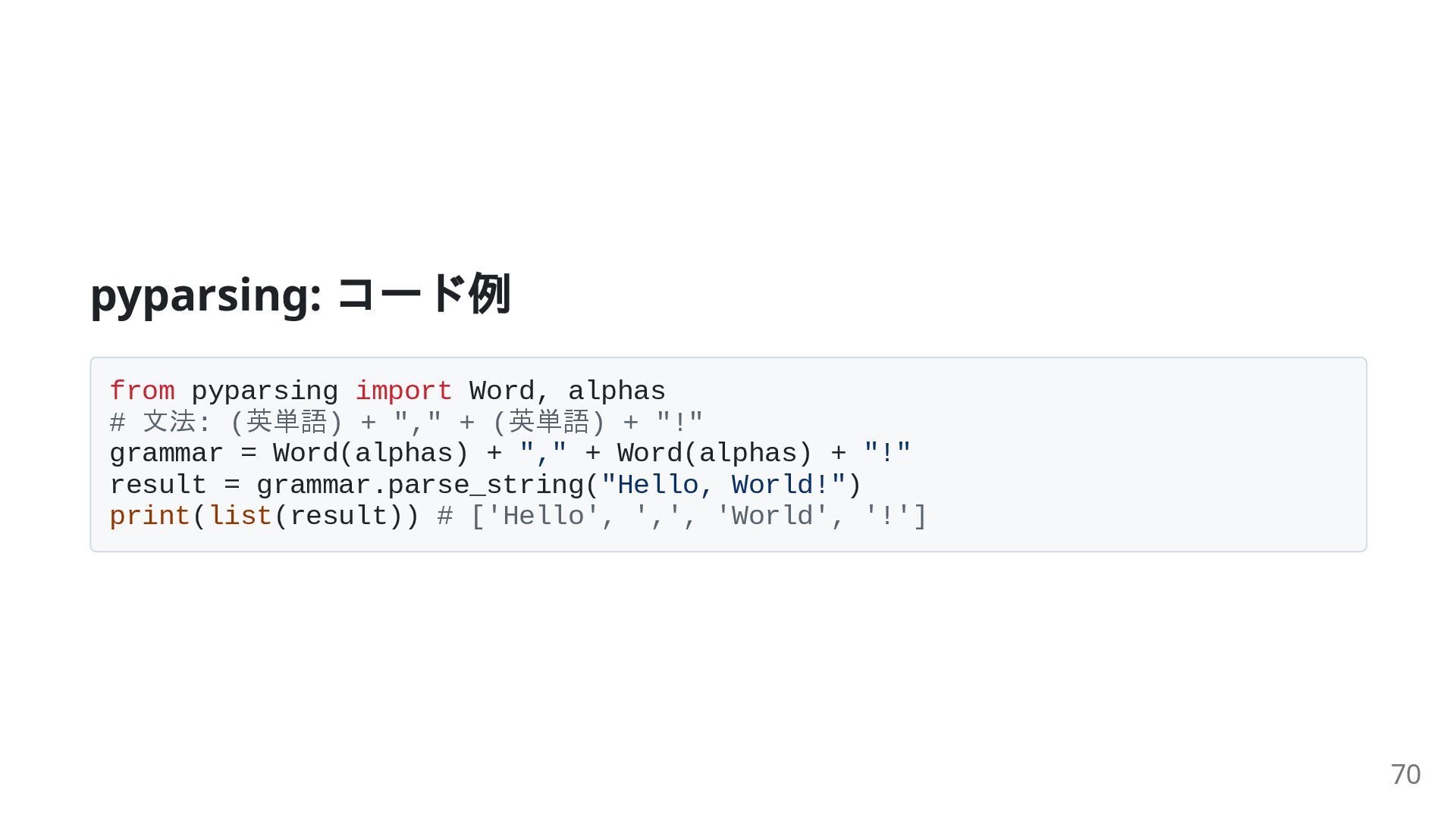 + "," + (英単語) + "!" grammar = Word(alphas) + "," + Word(alphas) + "!" result = grammar.parse_string("Hello, World!") print(list(result)) # ['Hello', ',', 'World', '!'] 70