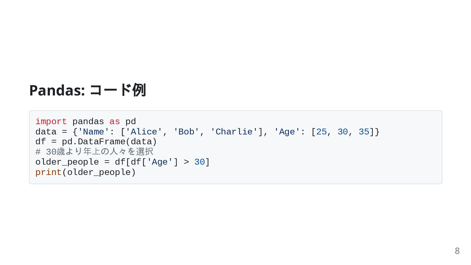 'Bob', 'Charlie'], 'Age': [25, 30, 35]} df = pd.DataFrame(data) # 30歳より年上の人々を選択 older_people = df[df['Age'] > 30] print(older_people) 8