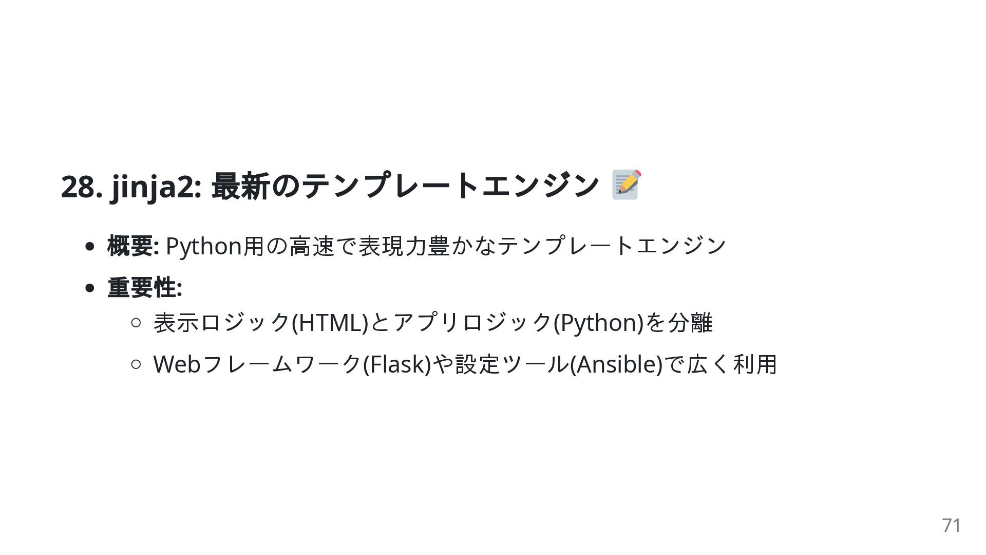 44. jinja2: コード例 from jinja2 import Template # `{{ name }}`