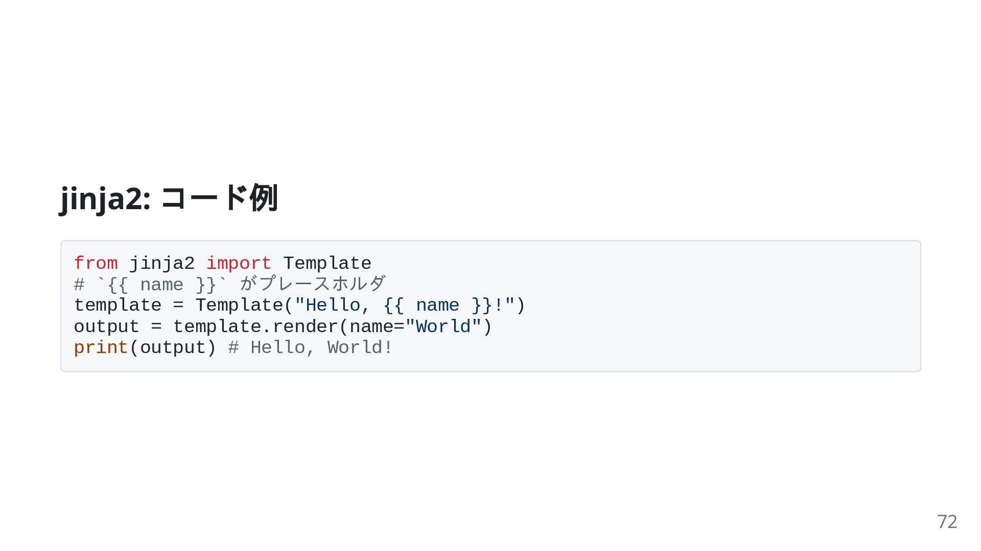 がプレースホルダ template = Template("Hello, {{ name }}!") output = template.render(name="World") print(output) # Hello, World! 72
