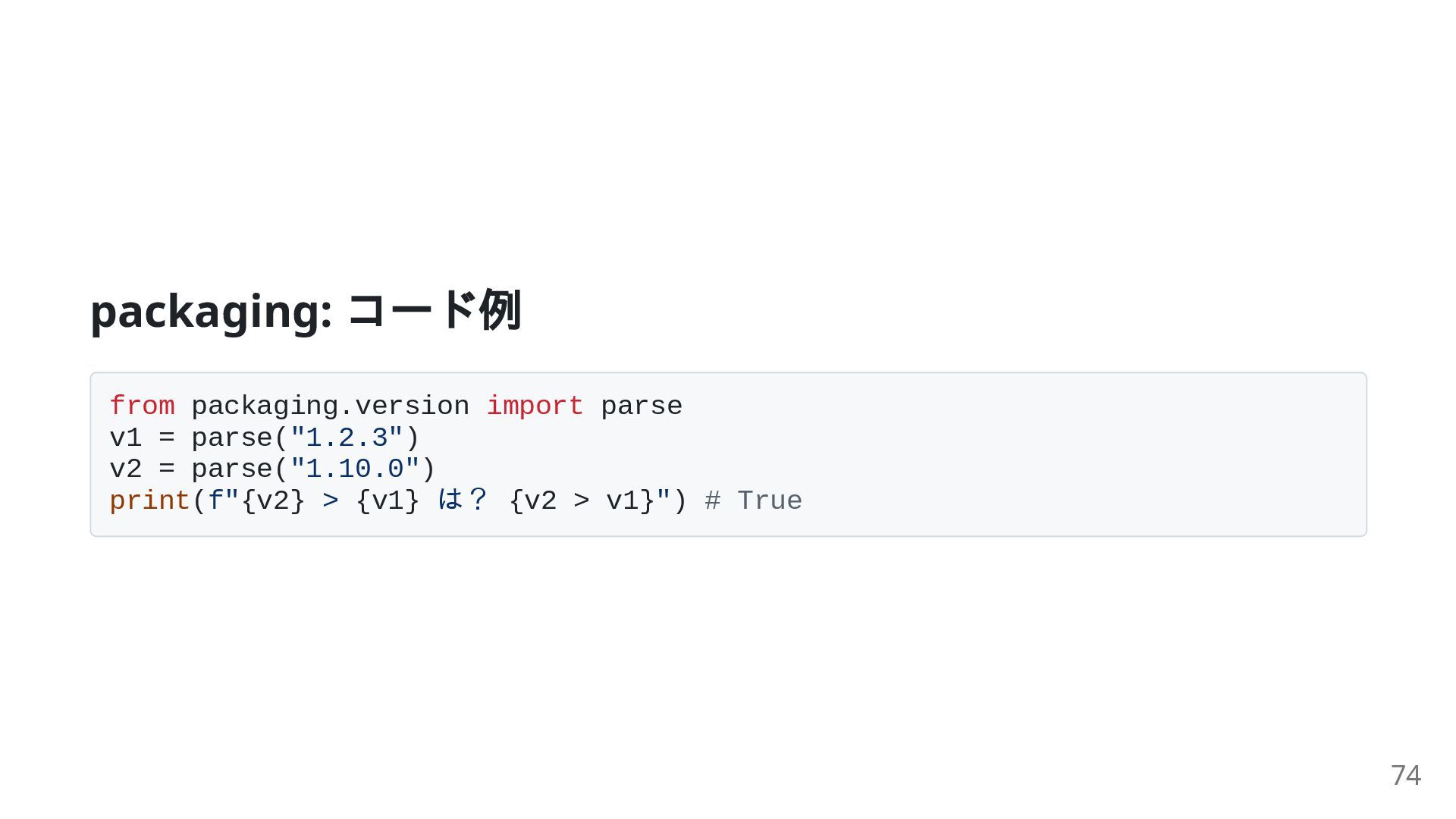 = parse("1.10.0") print(f"{v2} > {v1} は? {v2 > v1}") # True 74
