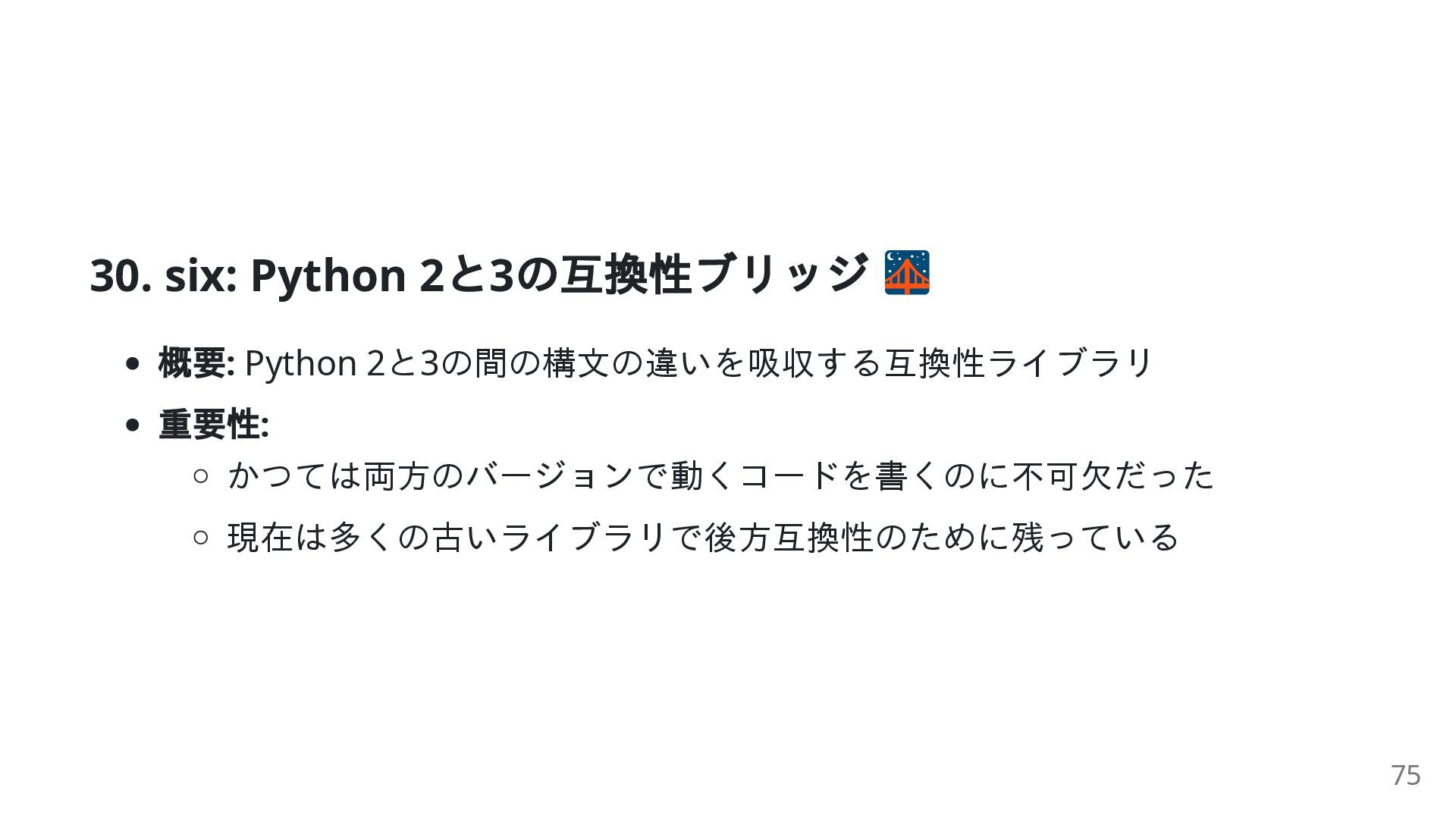 46. 30. six: Python 2 と3 の互換性ブリッジ 概要: Python 2と3の間の構文の違いを吸収する互換性ライブラリ 重要性: