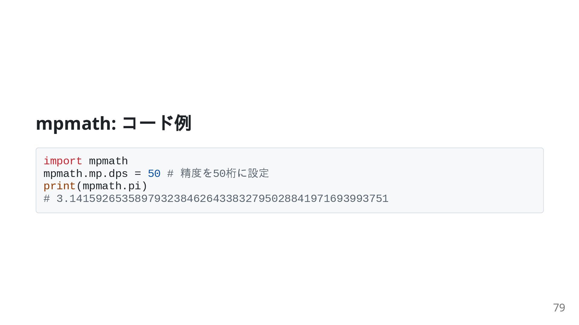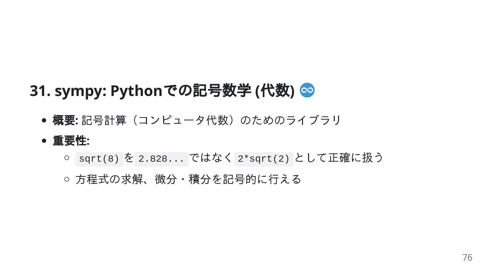sqrt(8) を 2.828... ではなく 2*sqrt(2) として正確に扱う 方程式の求解、微分・積分を記号的に行える 76
