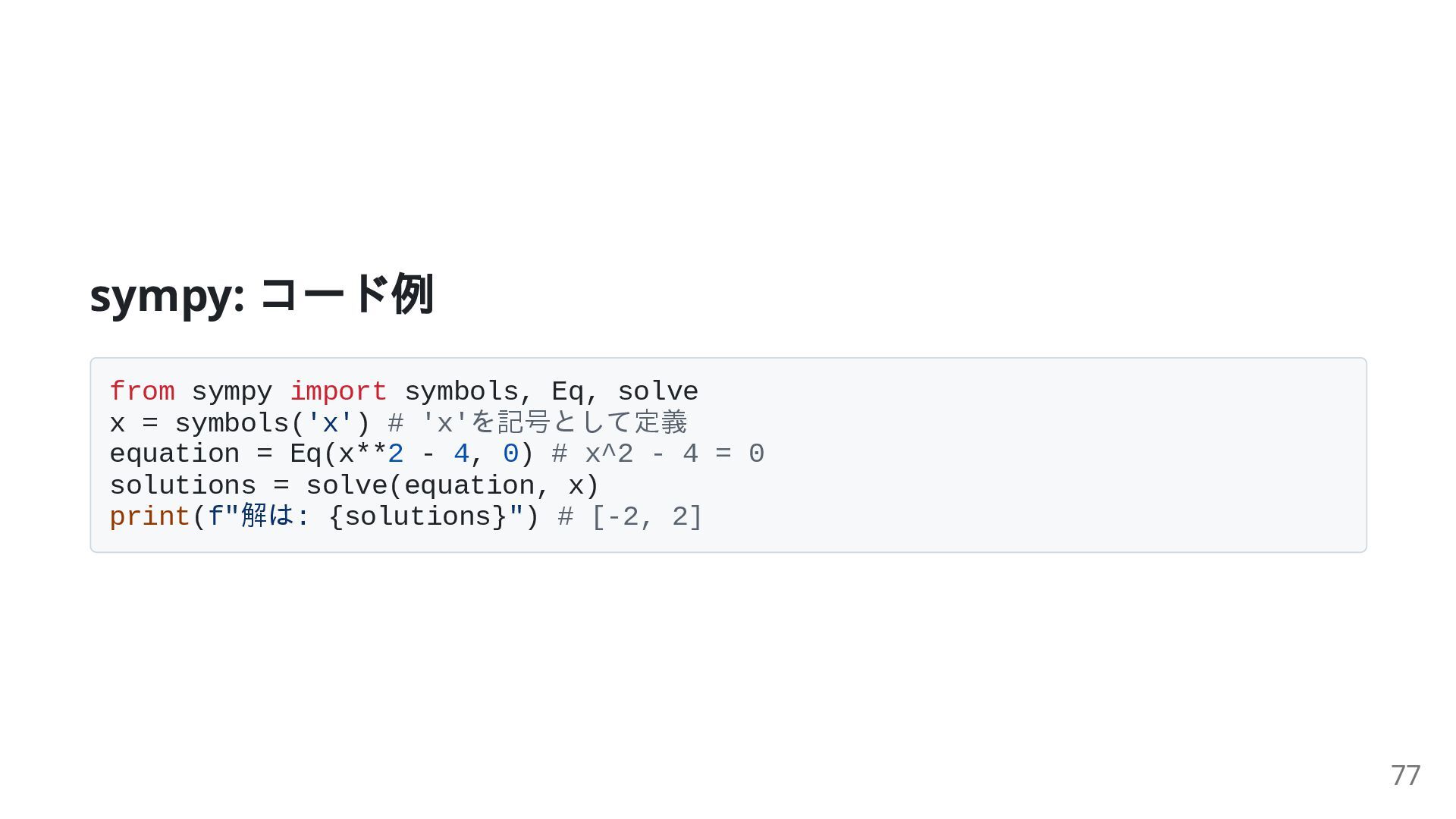 symbols('x') # 'x'を記号として定義 equation = Eq(x**2 - 4, 0) # x^2 - 4 = 0 solutions = solve(equation, x) print(f"解は: {solutions}") # [-2, 2] 77