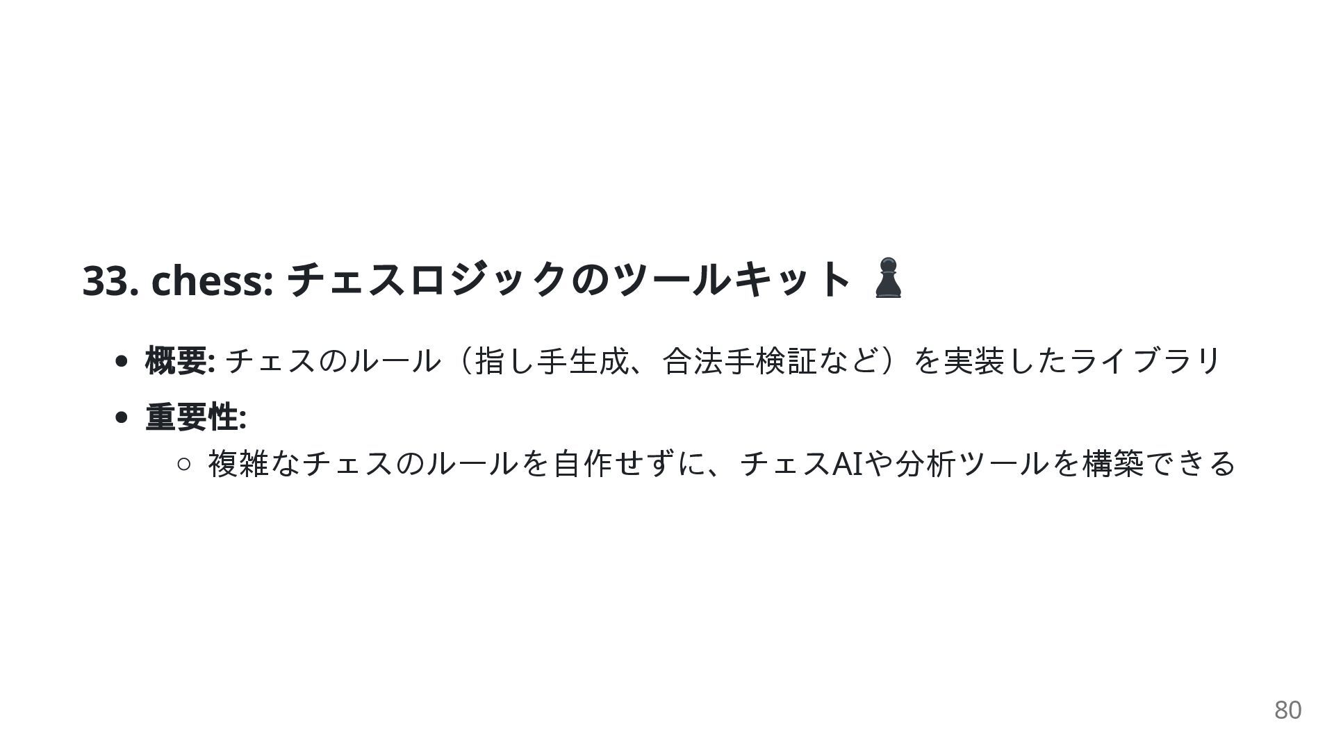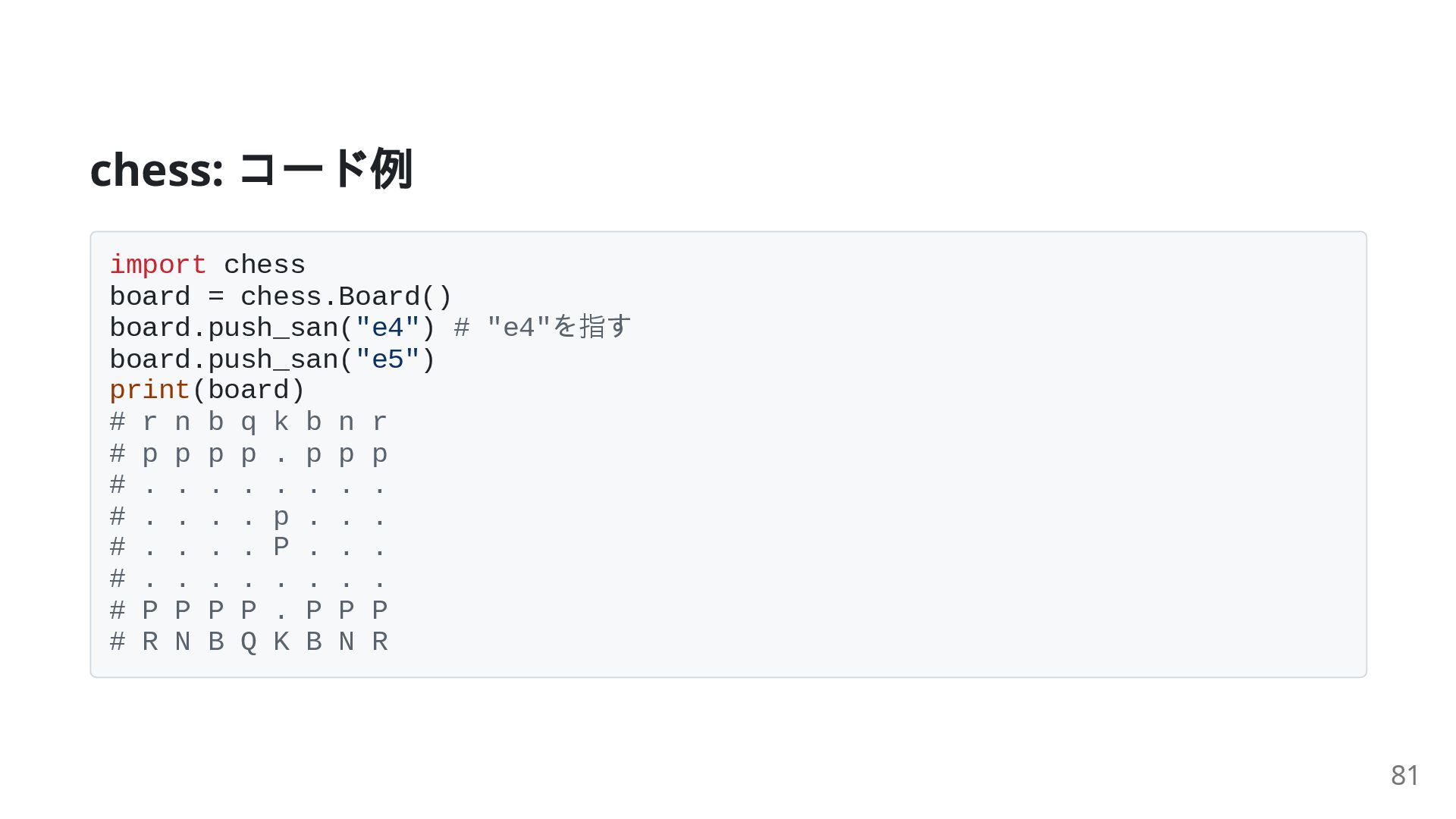 49. chess: コード例 import chess board = chess.Board() board.push_san("e4") # "e4"を指す