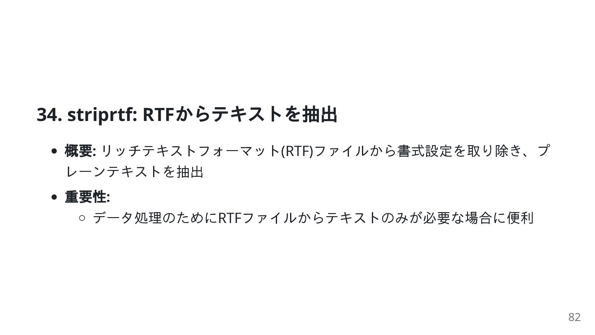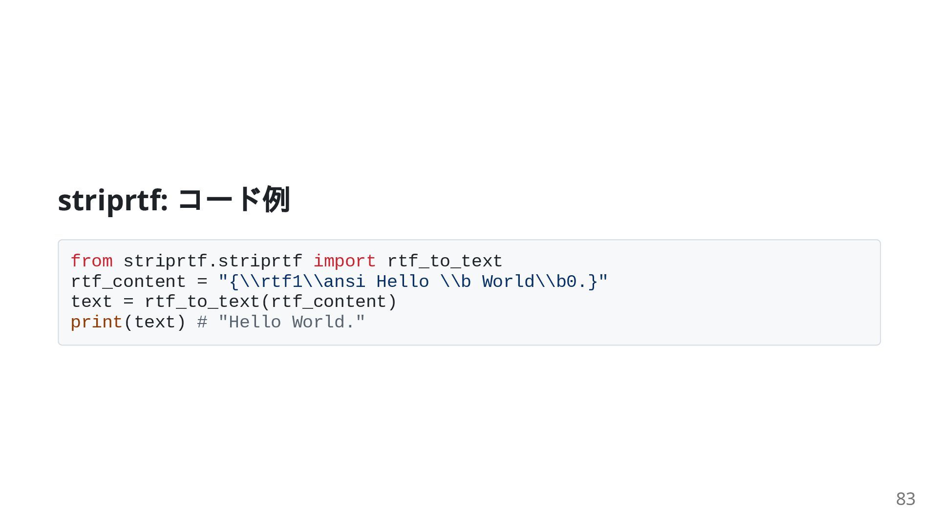 50. striprtf: コード例 from striprtf.striprtf import rtf_to_text rtf_content = "{\\rtf1\\ansi Hello