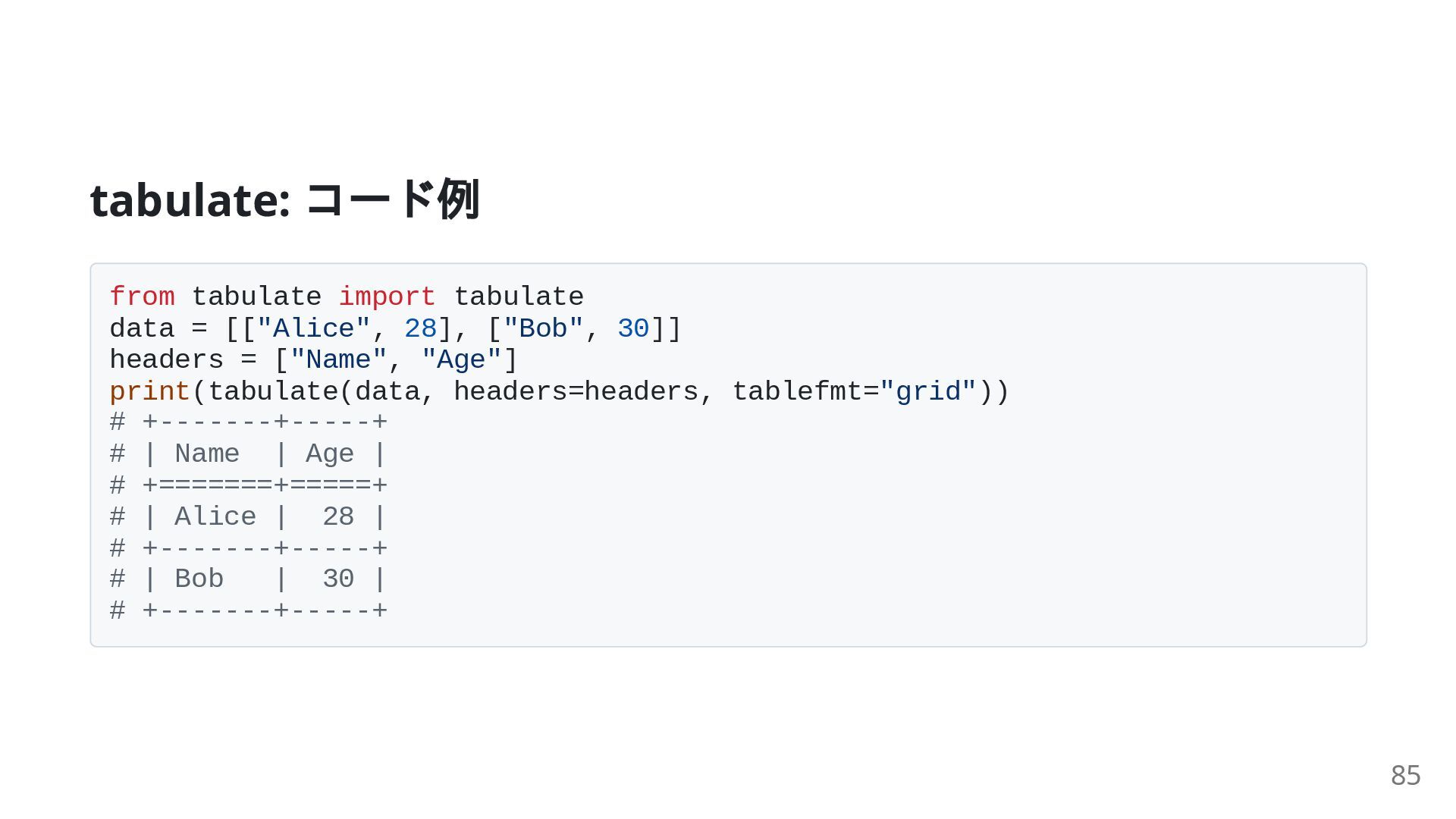 ["Bob", 30]] headers = ["Name", "Age"] print(tabulate(data, headers=headers, tablefmt="grid")) # +-------+-----+ # | Name | Age | # +=======+=====+ # | Alice | 28 | # +-------+-----+ # | Bob | 30 | # +-------+-----+ 85