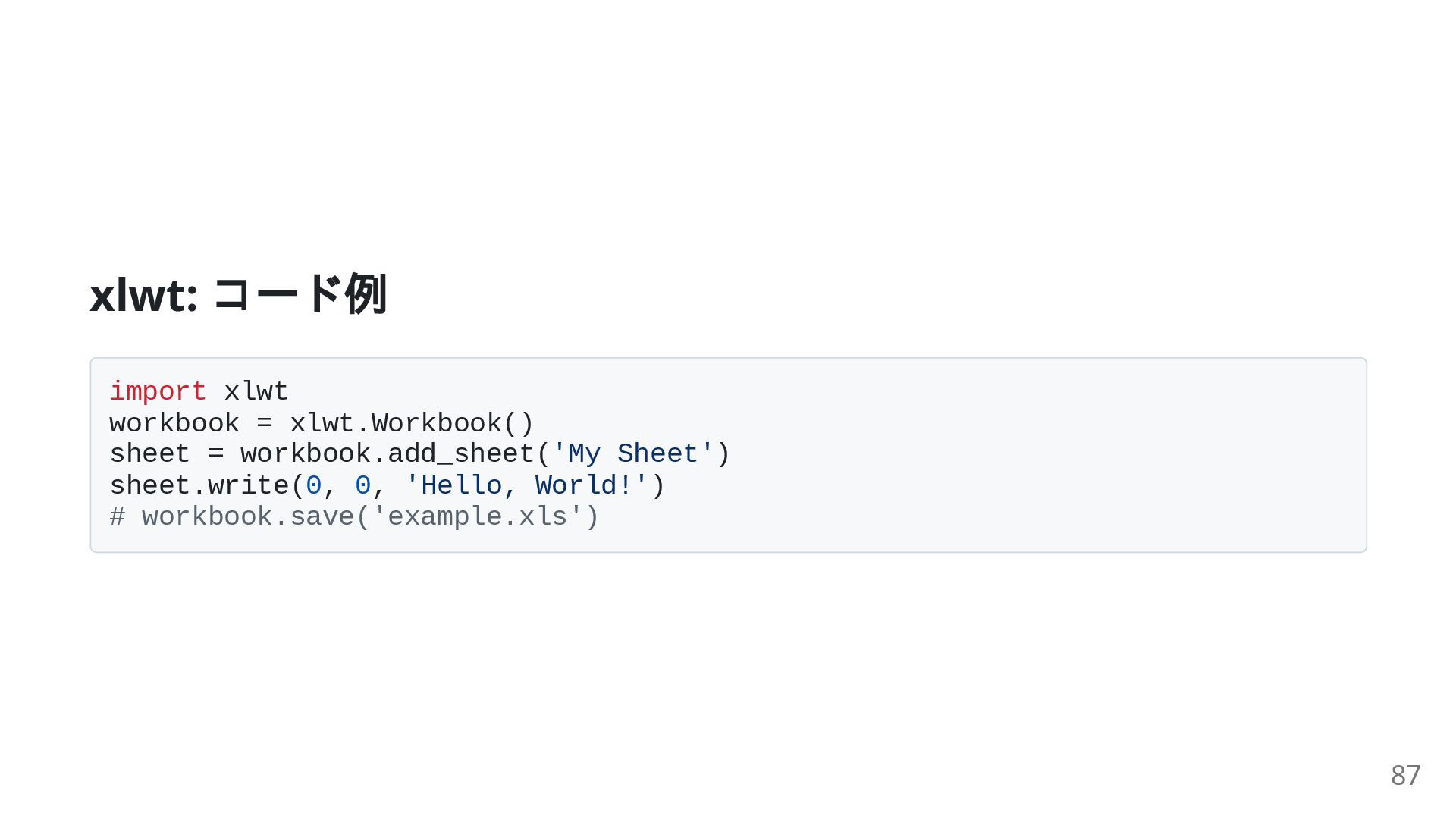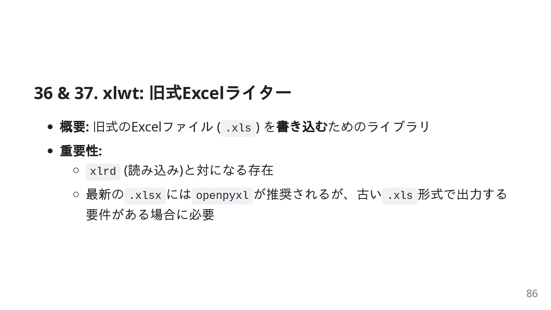 ) を 書き込むためのライブラリ 重要性: xlrd (読み込み)と対になる存在 最新の .xlsx には openpyxl が推奨されるが、古い .xls 形式で出力する 要件がある場合に必要 86