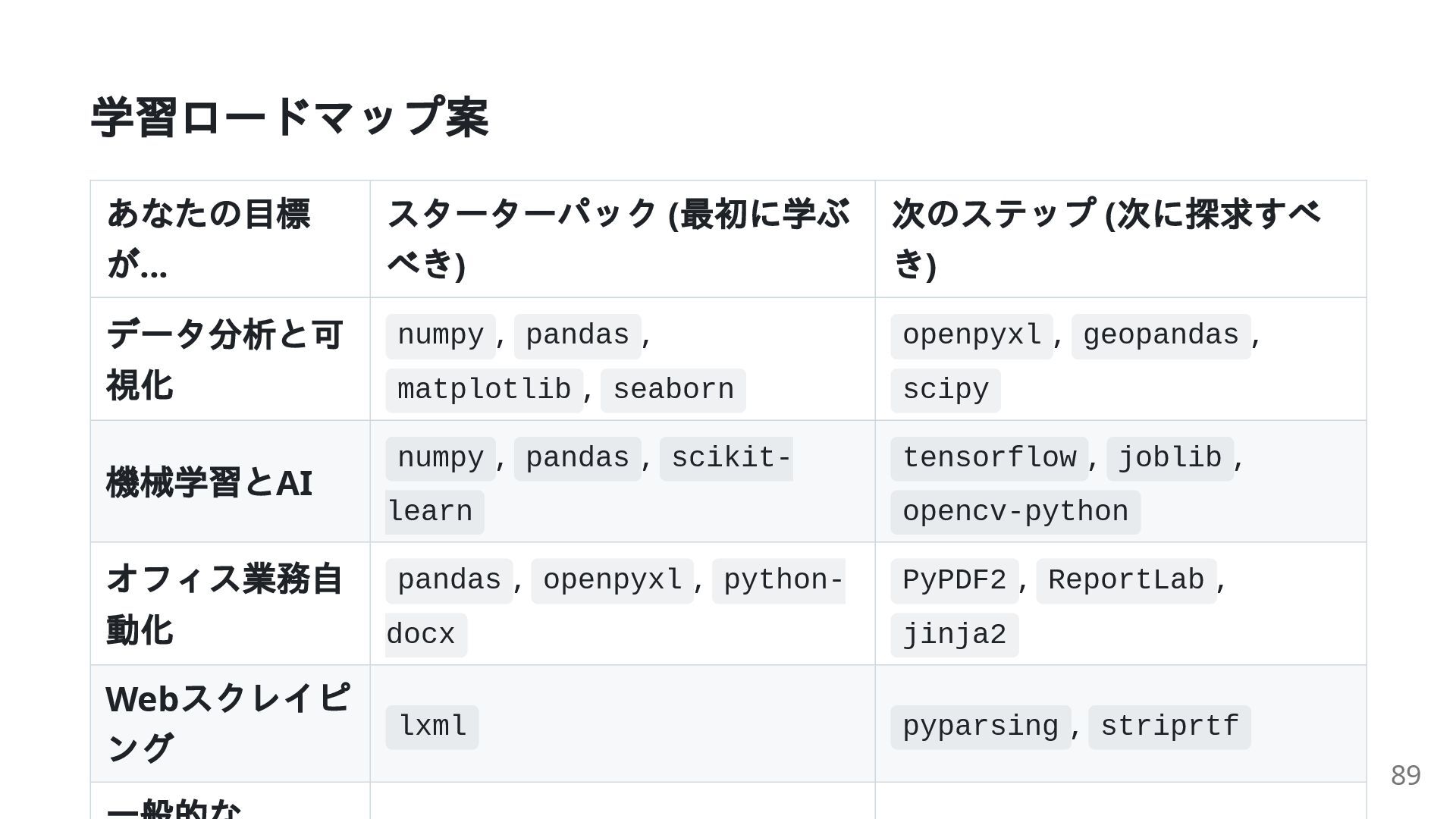 き) データ分析と可 視化 numpy , pandas , matplotlib , seaborn openpyxl , geopandas , scipy 機械学習とAI numpy , pandas , scikit- learn tensorflow , joblib , opencv-python オフィス業務自 動化 pandas , openpyxl , python- docx PyPDF2 , ReportLab , jinja2 Web スクレイピ ング lxml pyparsing , striprtf 89