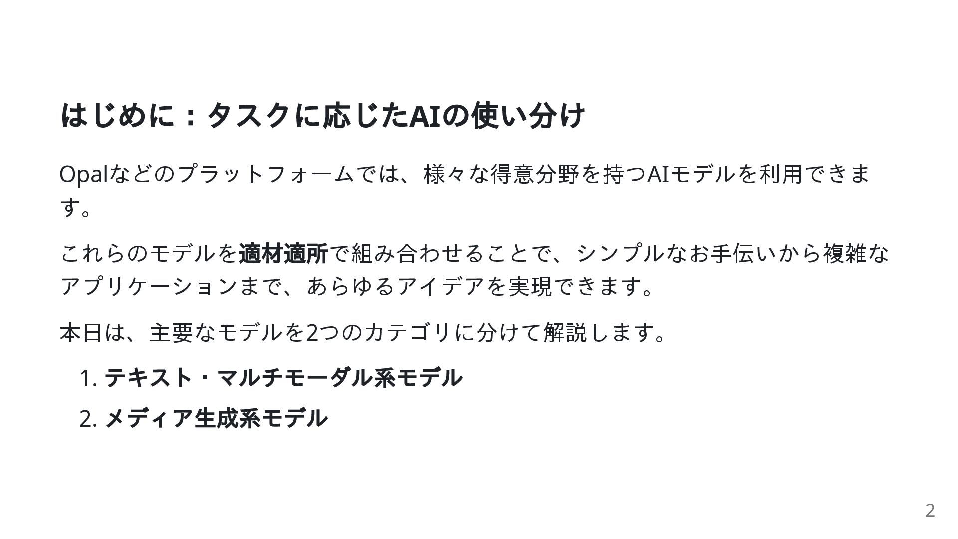 はじめに:タスクに応じたAI の使い分け Opalなどのプラットフォームでは、様々な得意分野を持つAIモデルを利用できま す。 これらのモデルを 適材適所で組み合わせることで、シンプルなお手伝いから複雑な アプリケーションまで、あらゆるアイデアを実現できます。 本日は、主要なモデルを2つのカテゴリに分けて解説します。 1. テキスト・マルチモーダル系モデル