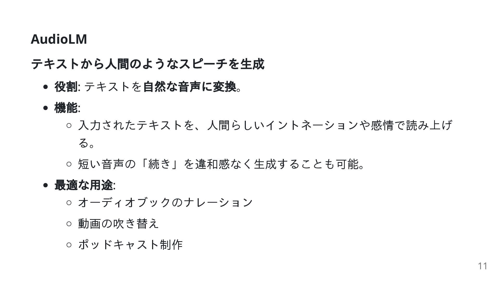 AudioLM テキストから人間のようなスピーチを生成 役割: テキストを 自然な音声に変換。 機能: 入力されたテキストを、人間らしいイントネーションや感情で読み上げ る。 短い音声の「続き」を違和感なく生成することも可能。 最適な用途: