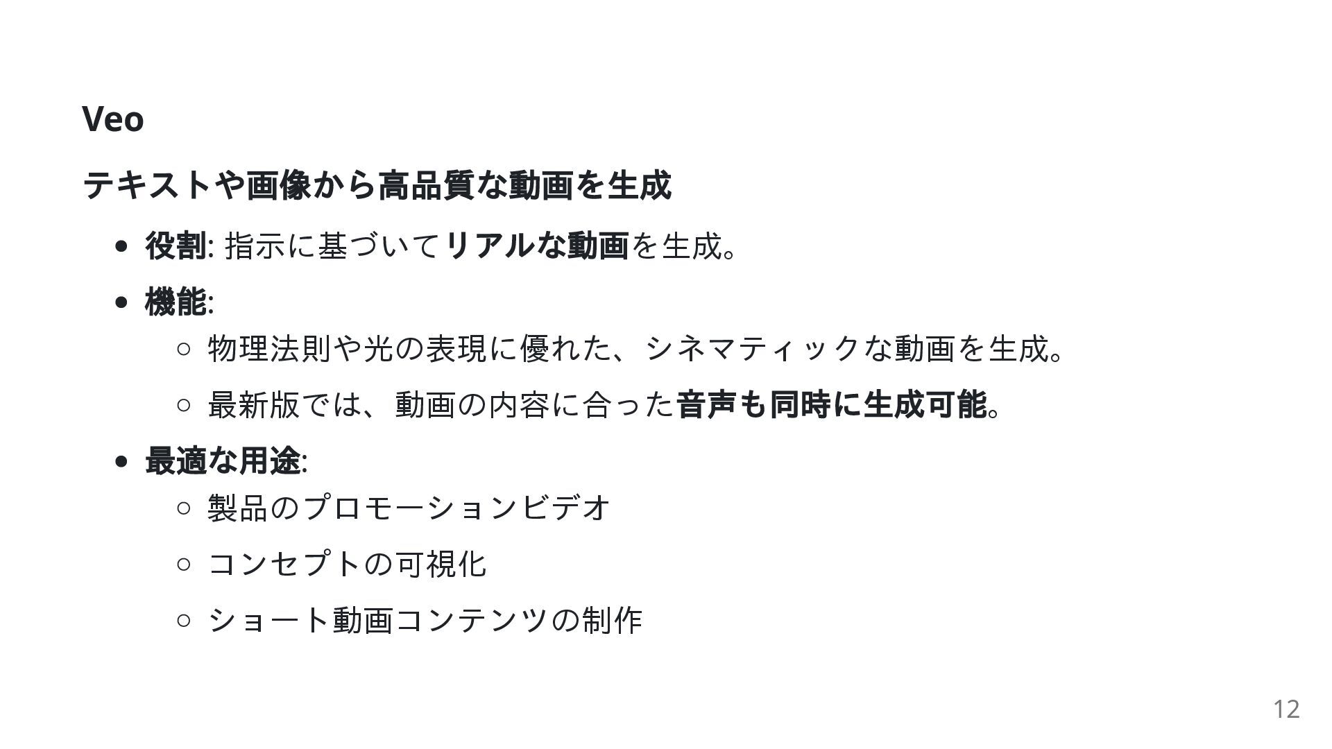 Veo テキストや画像から高品質な動画を生成 役割: 指示に基づいて リアルな動画を生成。 機能: 物理法則や光の表現に優れた、シネマティックな動画を生成。 最新版では、動画の内容に合った 音声も同時に生成可能。 最適な用途: