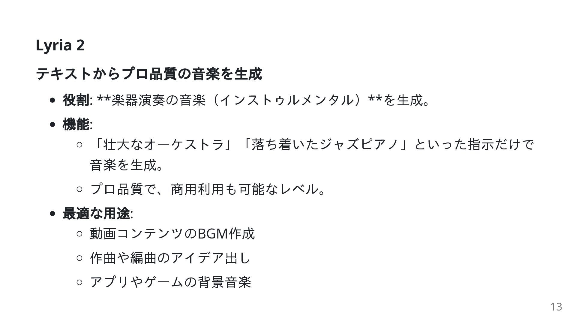 Lyria 2 テキストからプロ品質の音楽を生成 役割: **楽器演奏の音楽(インストゥルメンタル)**を生成。 機能: 「壮大なオーケストラ」「落ち着いたジャズピアノ」といった指示だけで 音楽を生成。 プロ品質で、商用利用も可能なレベル。 最適な用途: