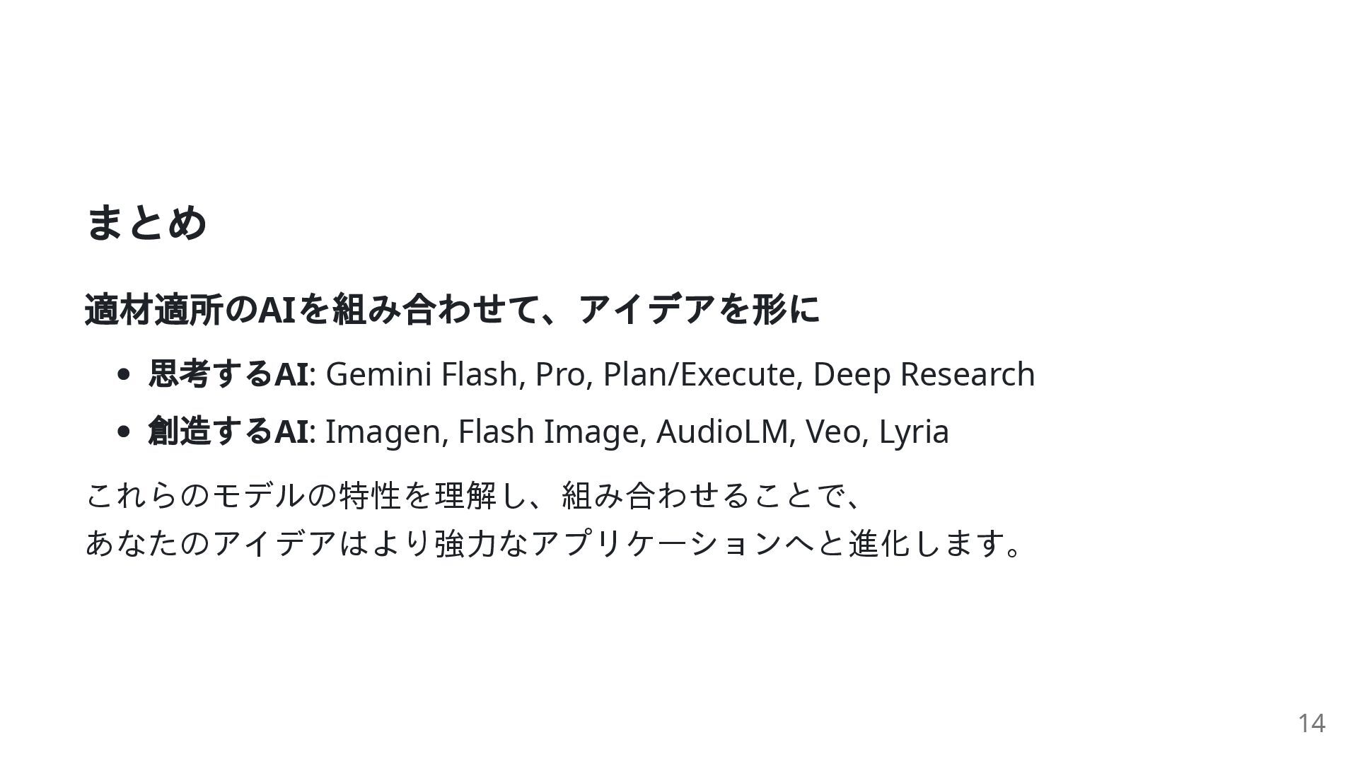 まとめ 適材適所のAI を組み合わせて、アイデアを形に 思考するAI: Gemini Flash, Pro, Plan/Execute, Deep Research