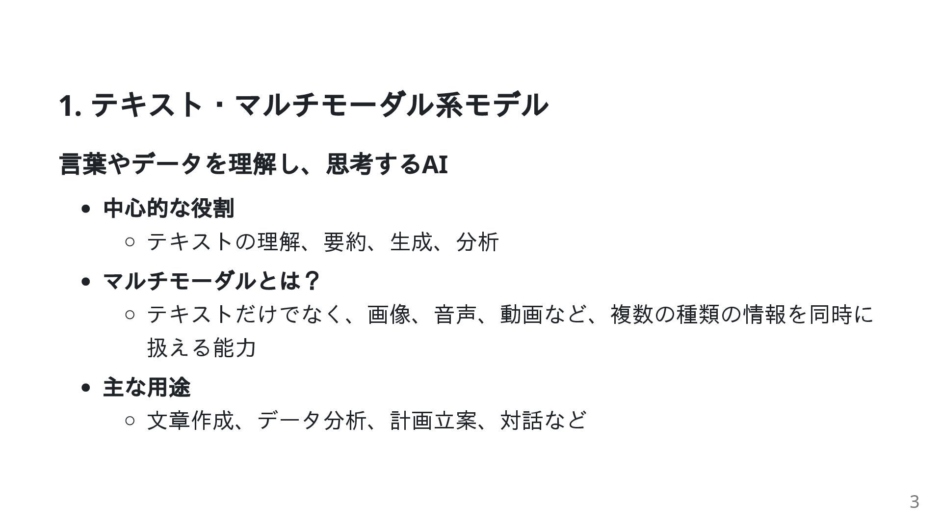 1. テキスト・マルチモーダル系モデル 言葉やデータを理解し、思考するAI 中心的な役割 テキストの理解、要約、生成、分析 マルチモーダルとは? テキストだけでなく、画像、音声、動画など、複数の種類の情報を同時に 扱える能力 主な用途 文章作成、データ分析、計画立案、対話など