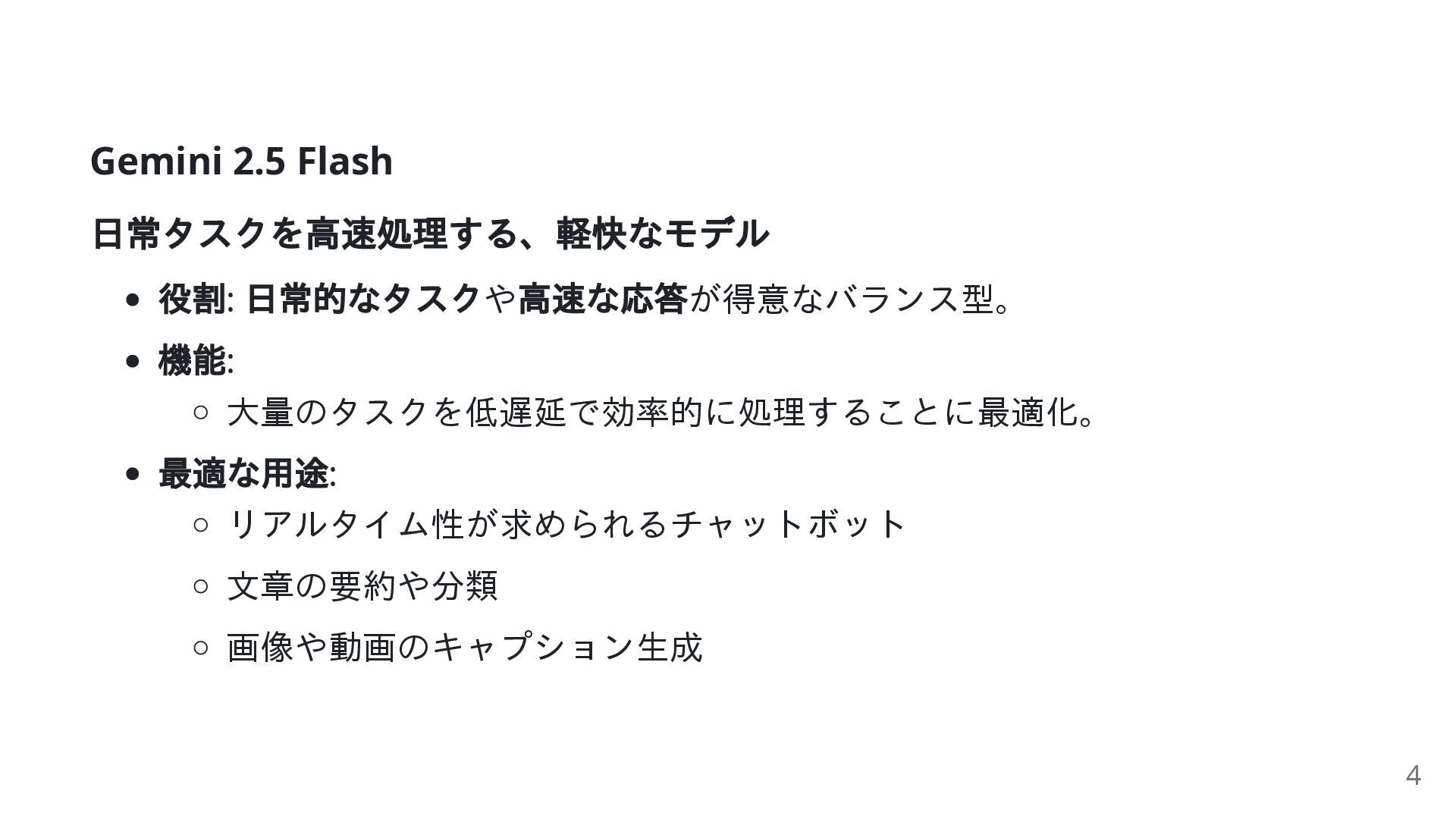 Gemini 2.5 Flash 日常タスクを高速処理する、軽快なモデル 役割: 日常的なタスクや 高速な応答が得意なバランス型。 機能: 大量のタスクを低遅延で効率的に処理することに最適化。 最適な用途: