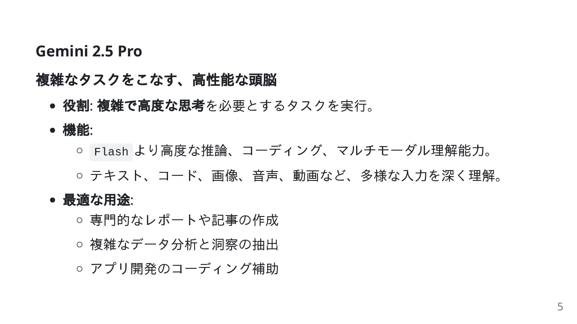 Gemini 2.5 Pro 複雑なタスクをこなす、高性能な頭脳 役割: 複雑で高度な思考を必要とするタスクを実行。 機能: Flash より高度な推論、コーディング、マルチモーダル理解能力。 テキスト、コード、画像、音声、動画など、多様な入力を深く理解。