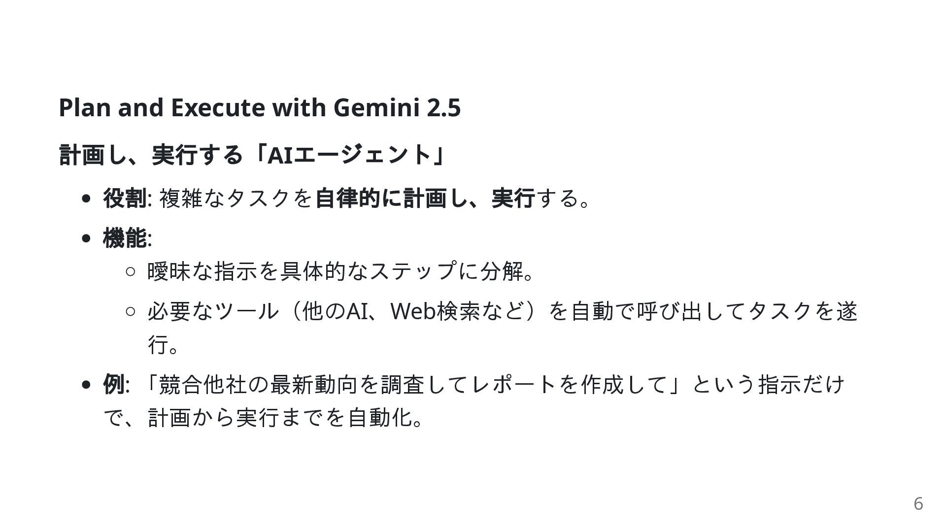 Plan and Execute with Gemini 2.5 計画し、実行する「AI エージェント」 役割: 複雑なタスクを