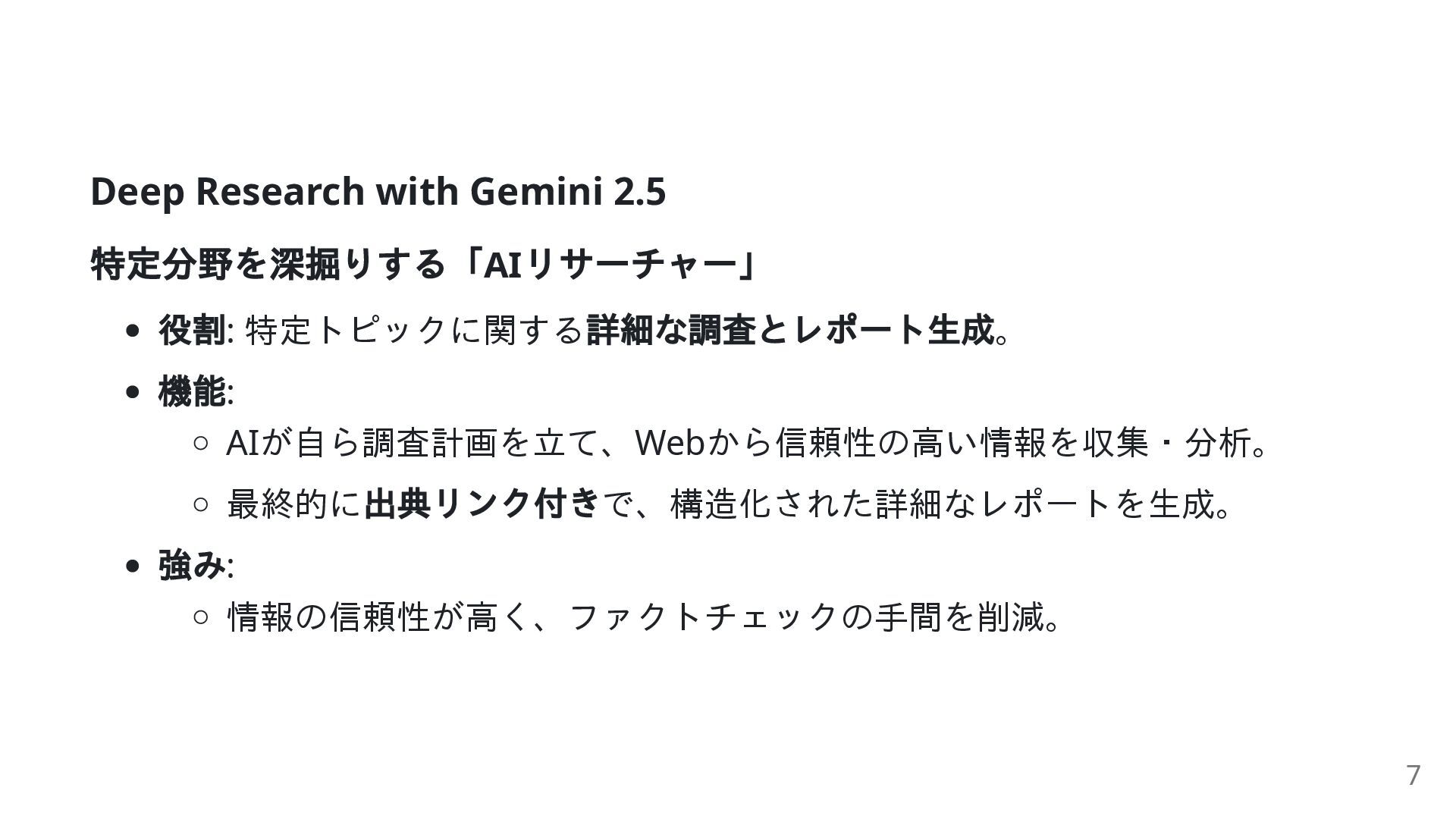 Deep Research with Gemini 2.5 特定分野を深掘りする「AI リサーチャー」 役割: 特定トピックに関する 詳細な調査とレポート生成。