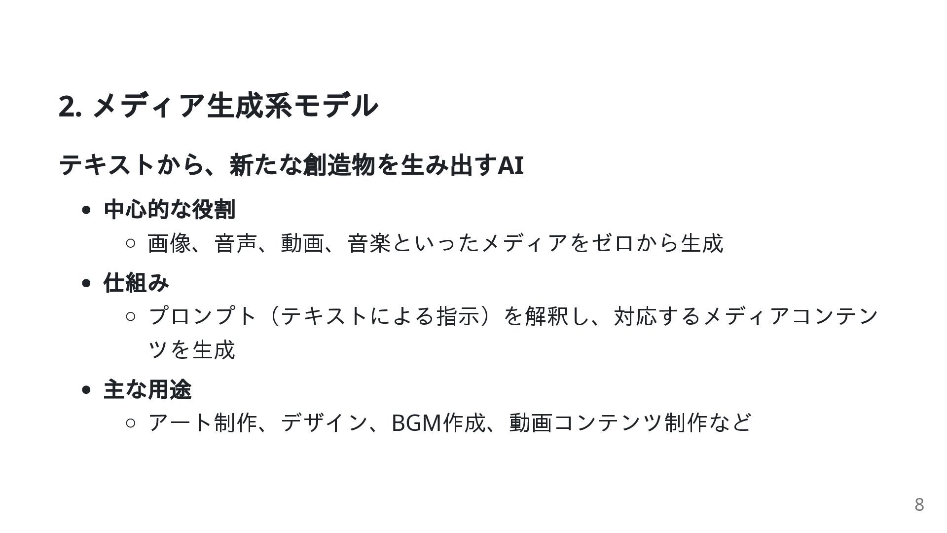 2. メディア生成系モデル テキストから、新たな創造物を生み出すAI 中心的な役割 画像、音声、動画、音楽といったメディアをゼロから生成 仕組み プロンプト(テキストによる指示)を解釈し、対応するメディアコンテン ツを生成 主な用途 アート制作、デザイン、BGM作成、動画コンテンツ制作など