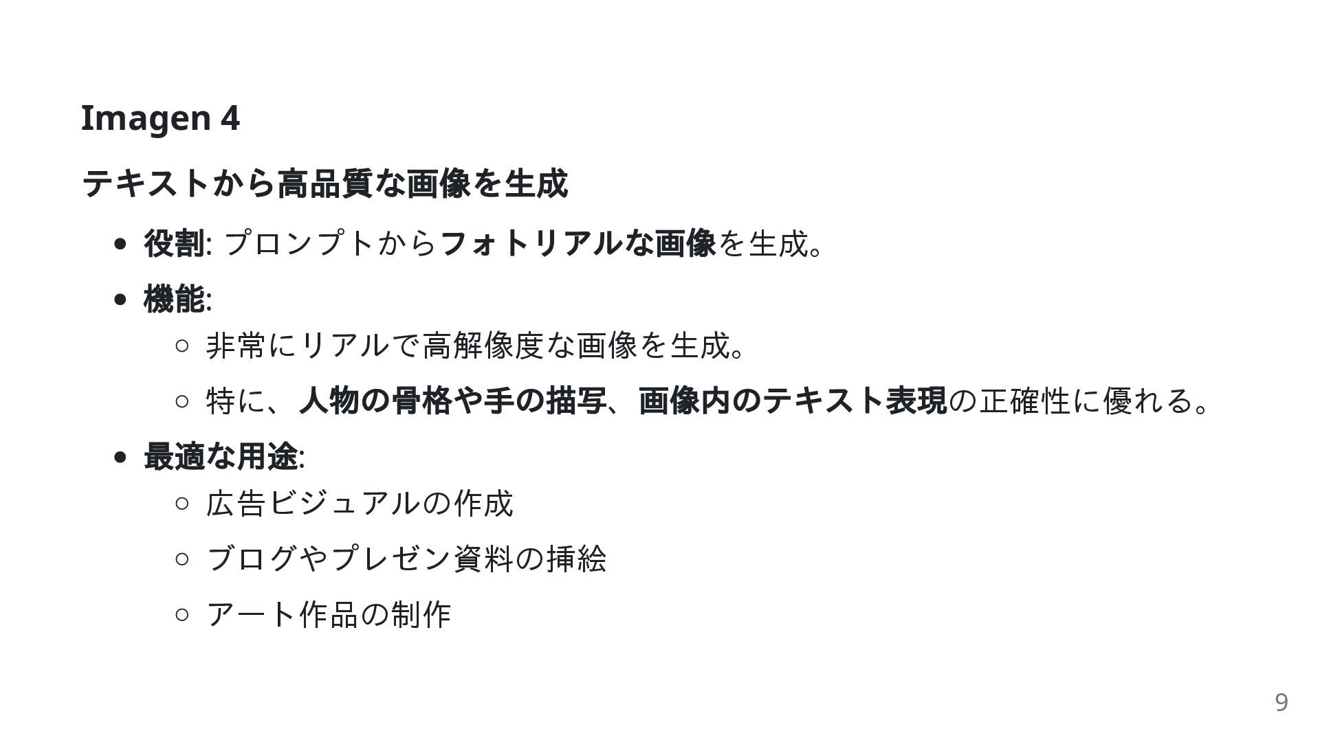 Imagen 4 テキストから高品質な画像を生成 役割: プロンプトから フォトリアルな画像を生成。 機能: 非常にリアルで高解像度な画像を生成。 特に、 人物の骨格や手の描写、