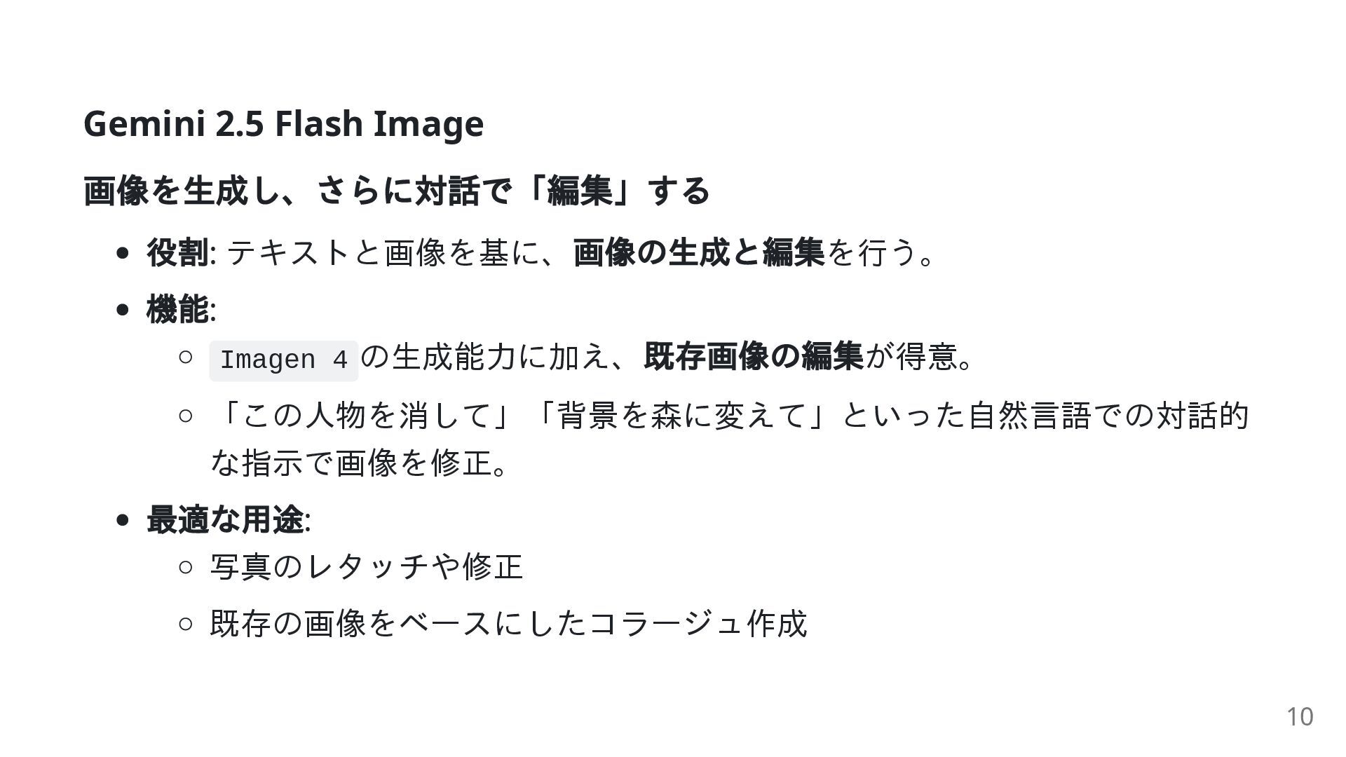 Gemini 2.5 Flash Image 画像を生成し、さらに対話で「編集」する 役割: テキストと画像を基に、 画像の生成と編集を行う。 機能: Imagen