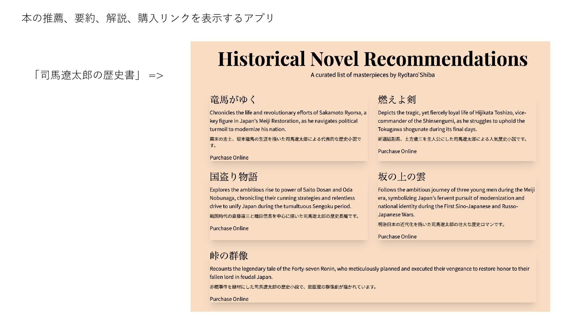 本の推薦、要約、解説、購入リンクを表示するアプリ 「司馬遼太郎の歴史書」 =>