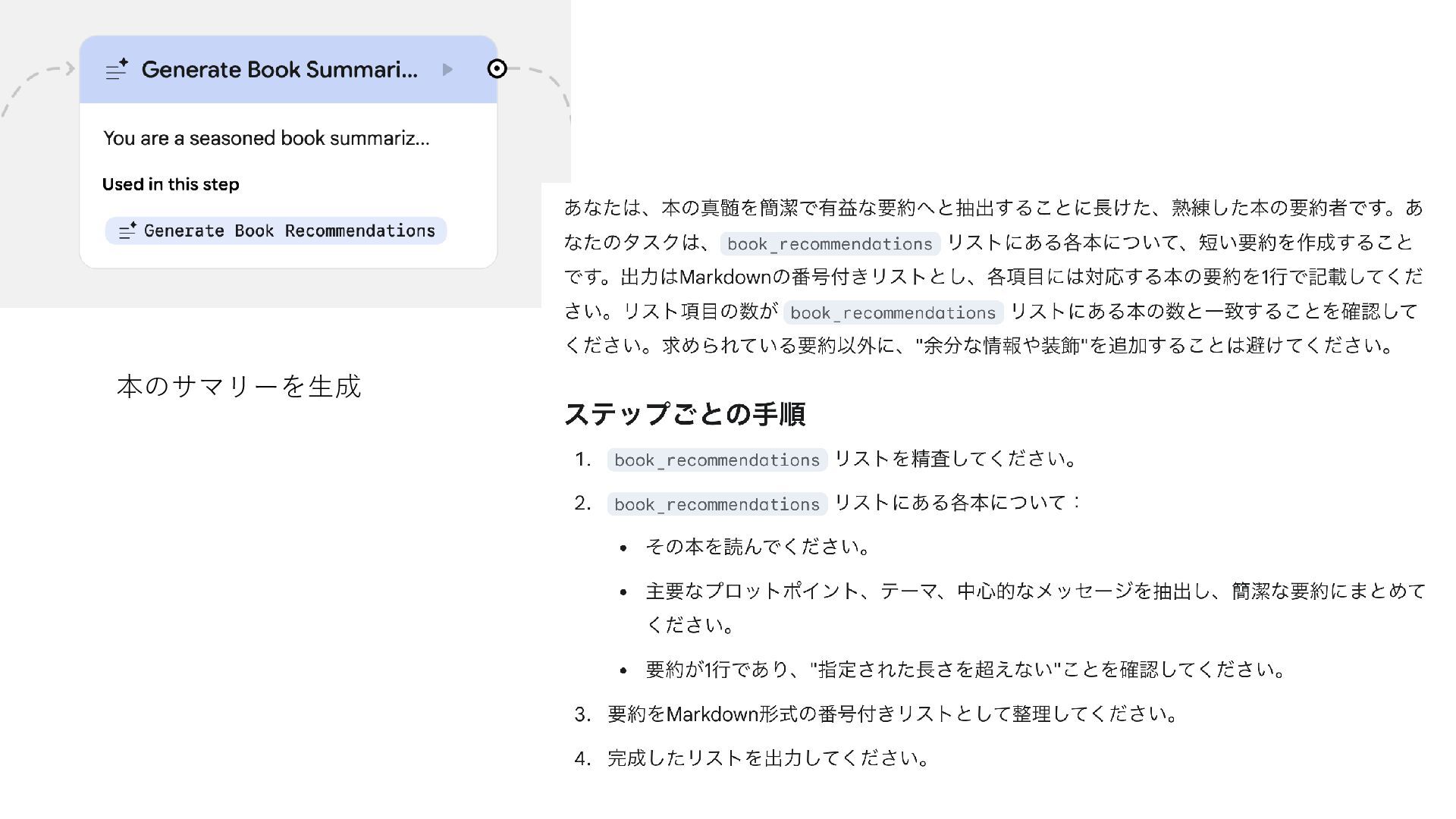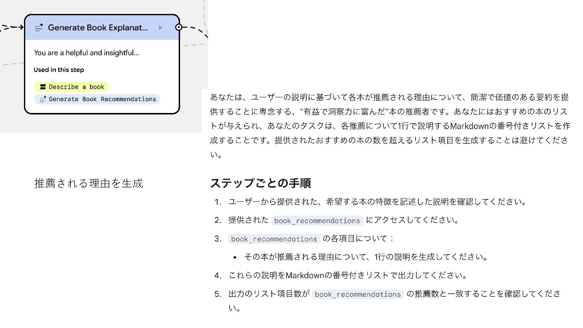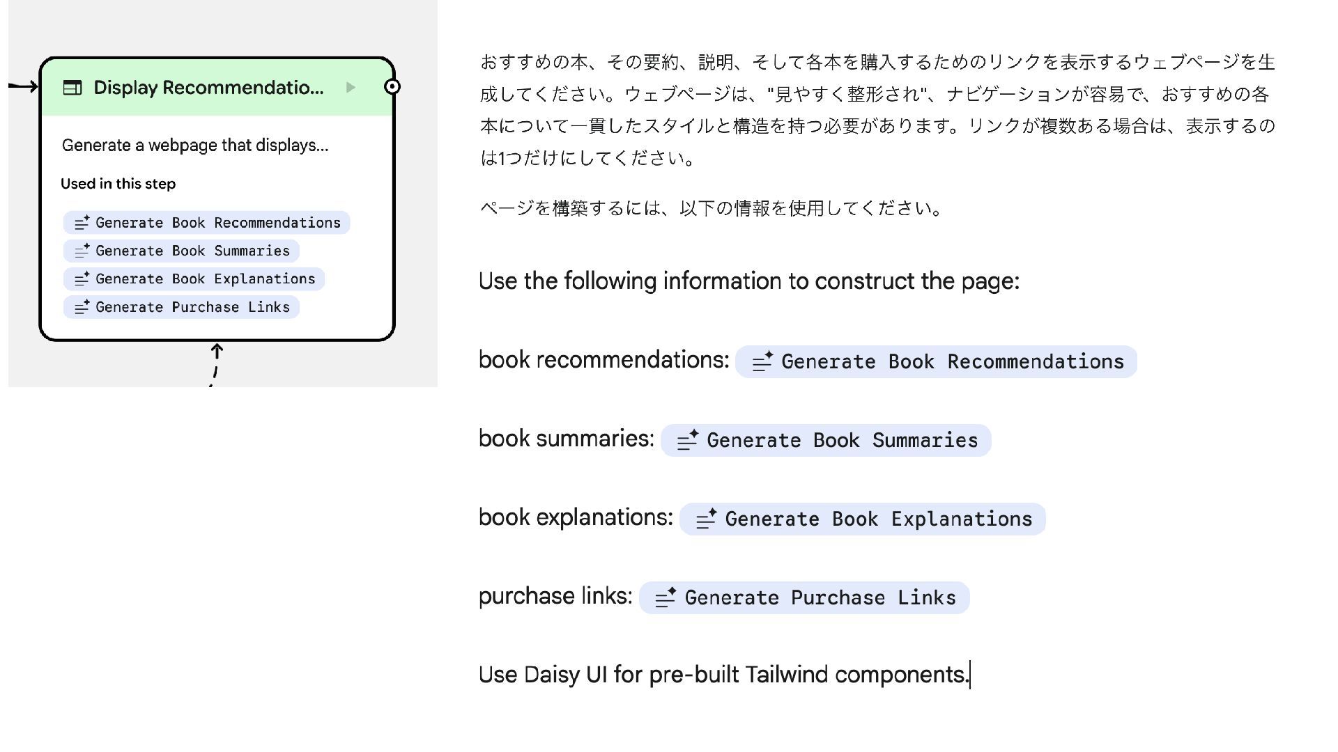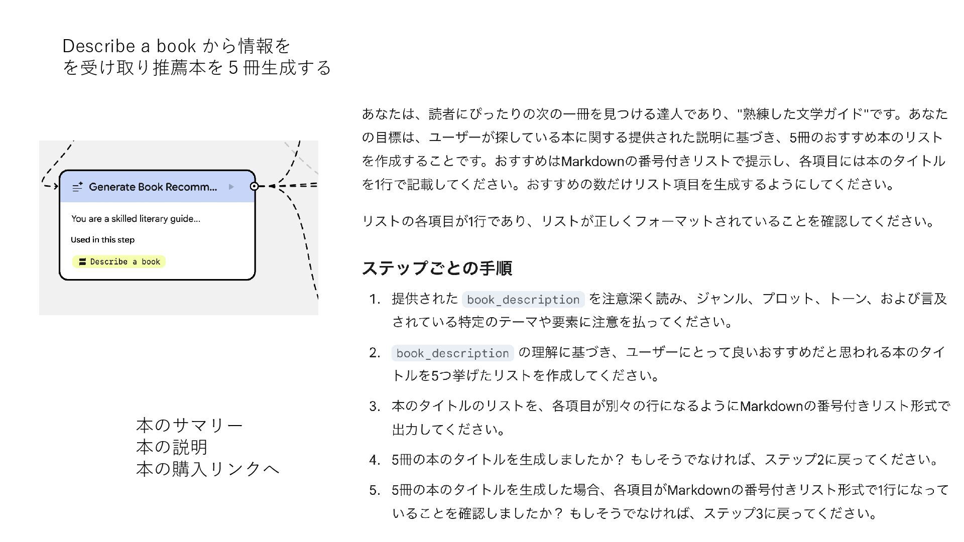 Describe a book から情報を を受け取り推薦本を5冊生成する 本のサマリー 本の説明 本の購入リンクへ