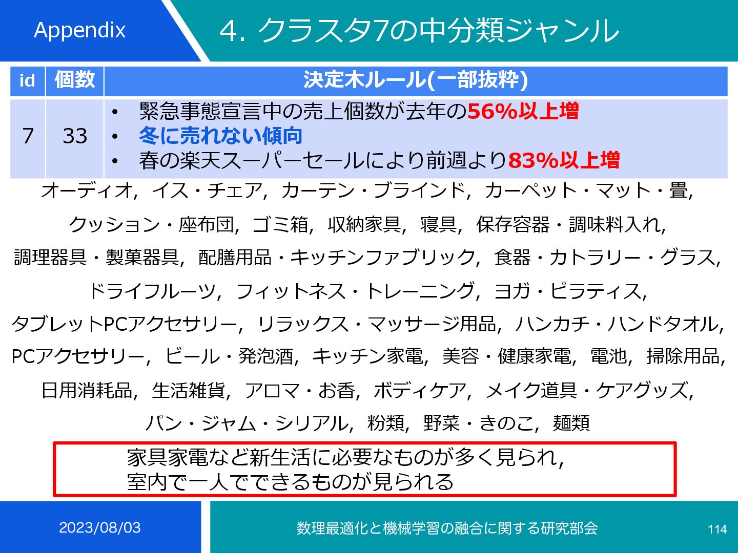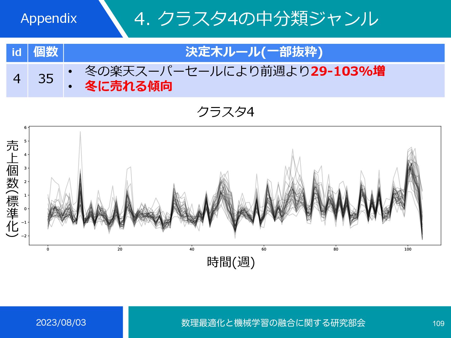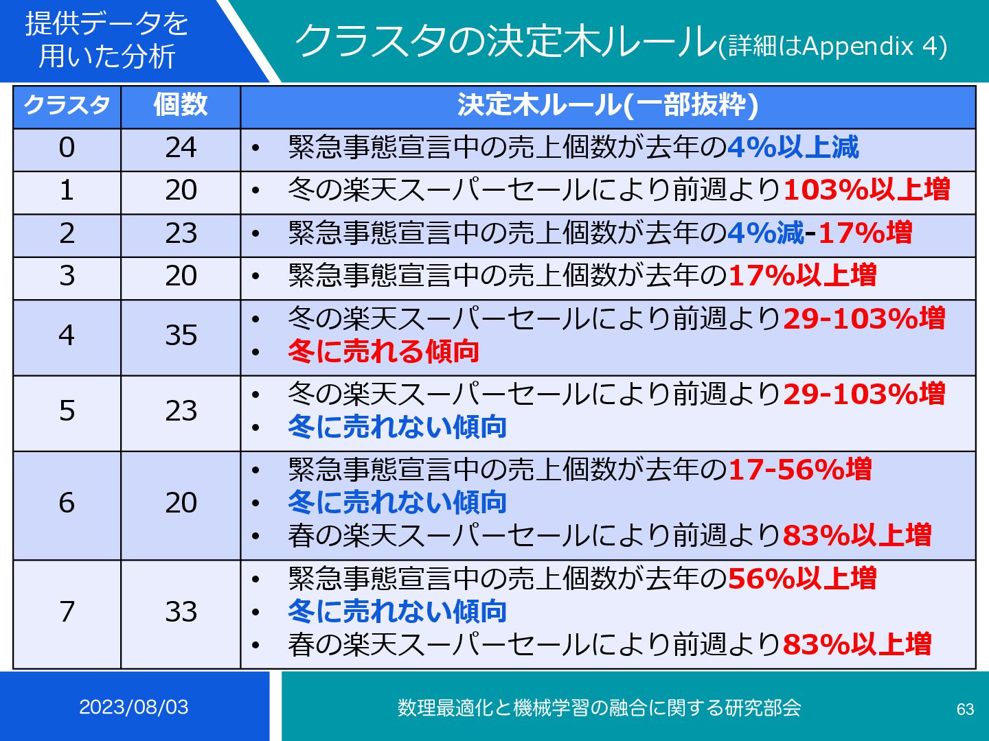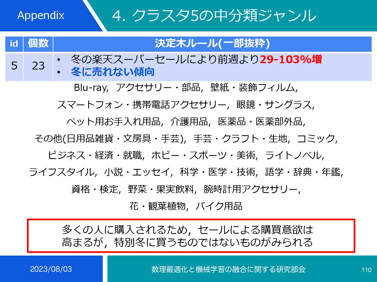 4 35 • 冬の楽天スーパーセールにより前週より29-103%増 • 冬に売れる傾向 インテリア⼩物・置物, ライト・照明器具, メンズ, コーヒー・お茶⽤品, 鍋・フ ライパン, ボディピアス, あめ・ミント・ガム, せんべい・⽶菓, 和菓⼦, 製菓・ 製パン材料, 健康グッズ, 健康⾷品, NintendoSwitch, PCサプライ・消耗品, 外付けドライブ・ストレージ, ウイスキー, ワイン, コレク ション, 季節・空調家電, ⽣活家電, ⽇本酒, 焼酎, バス⽤品, ⽂房具・事務⽤品, 絵本・児童書・図鑑, コーヒー, その他(⾷品), チーズ・乳製品, フルーツ・果物, 乾物, 惣菜, 漬け物・梅⼲し・キムチ, ⽶・雑 穀, 精⾁・⾁加⼯品, ⿂介類・⽔産加⼯品 ふるさと納税等による影響から⾷べ物が多い, クリスマスプレゼントに⽤いられるものが⾒られる