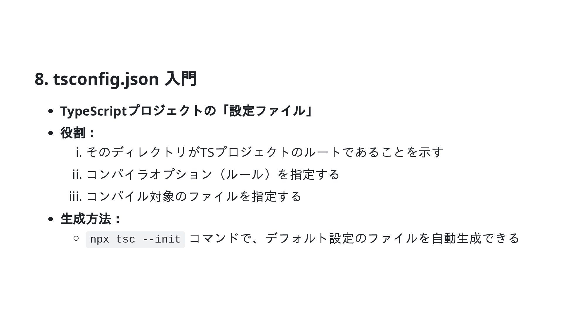 8. tsconfig.json 入門 TypeScript プロジェクトの「設定ファイル」 役割: i. そのディレクトリがTSプロジェクトのルートであることを示す ii. コンパイラオプション(ルール)を指定する