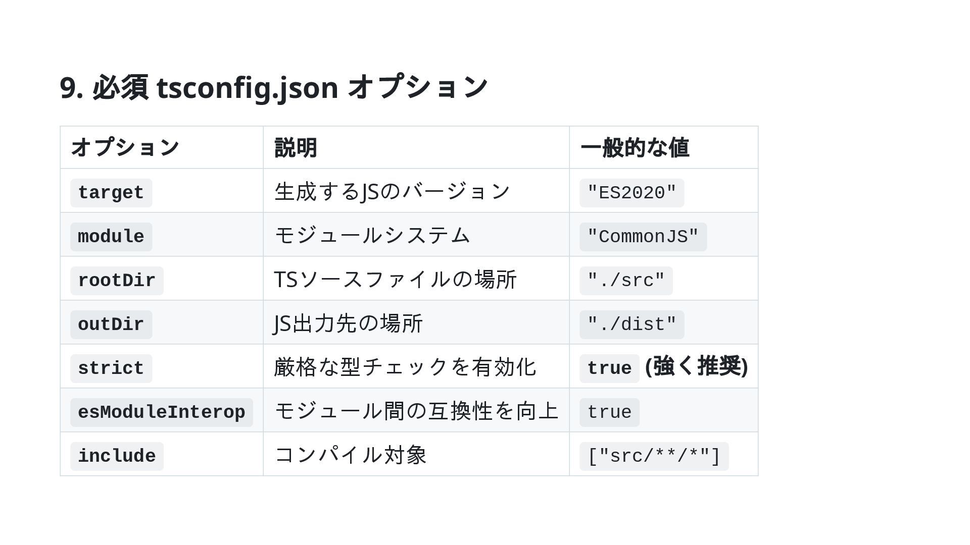9. 必須 tsconfig.json オプション オプション 説明 一般的な値 target 生成するJSのバージョン "ES2020"