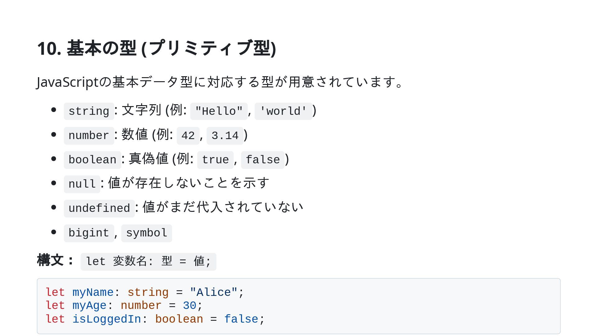 , 'world' ) number : 数値 (例: 42 , 3.14 ) boolean : 真偽値 (例: true , false ) null : 値が存在しないことを示す undefined : 値がまだ代入されていない bigint , symbol 構文: let 変数名: 型 = 値; let myName: string = "Alice"; let myAge: number = 30; let isLoggedIn: boolean = false;