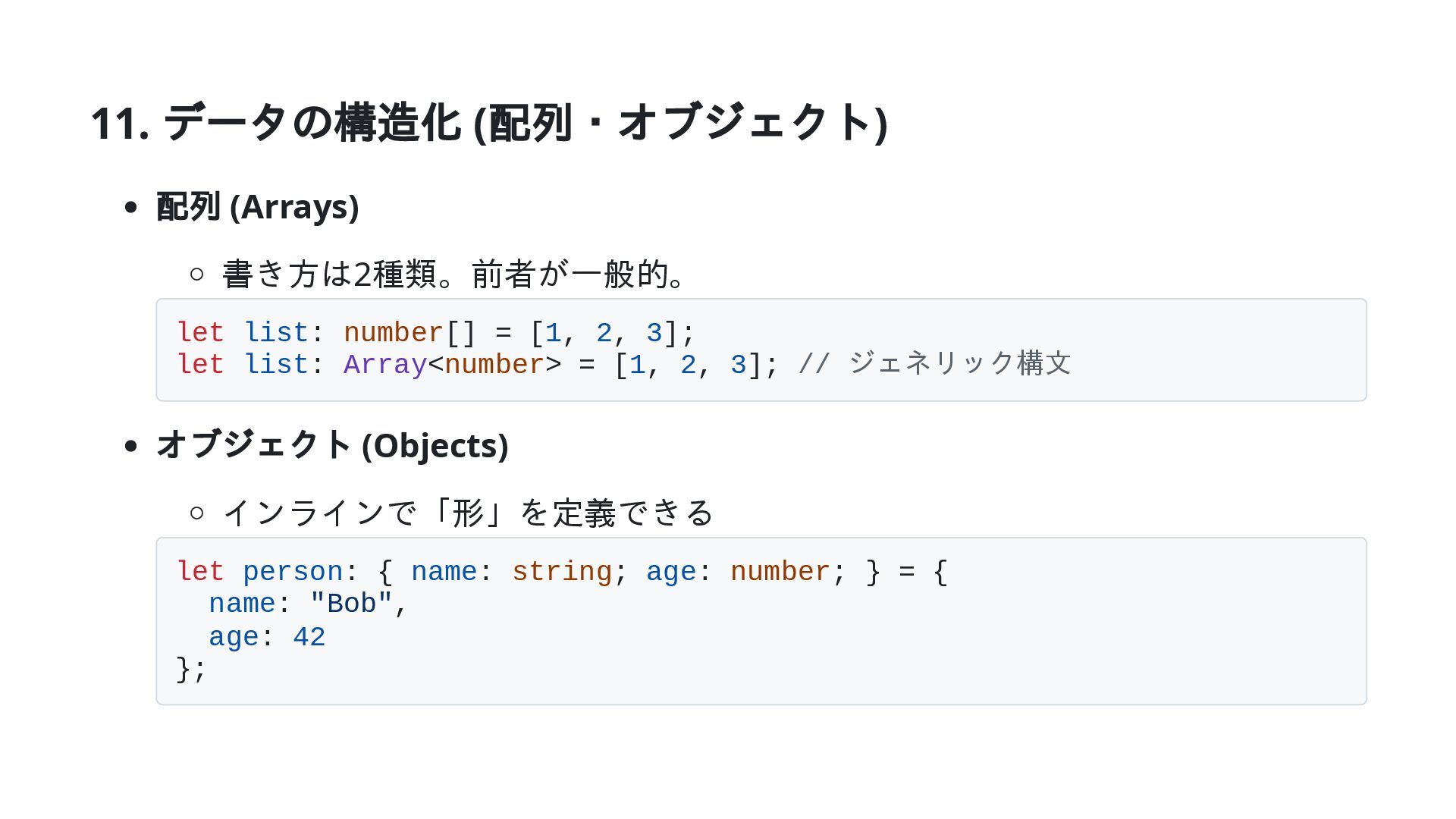 11. データの構造化 ( 配列・オブジェクト) 配列 (Arrays) 書き方は2種類。前者が一般的。 let list: number[]
