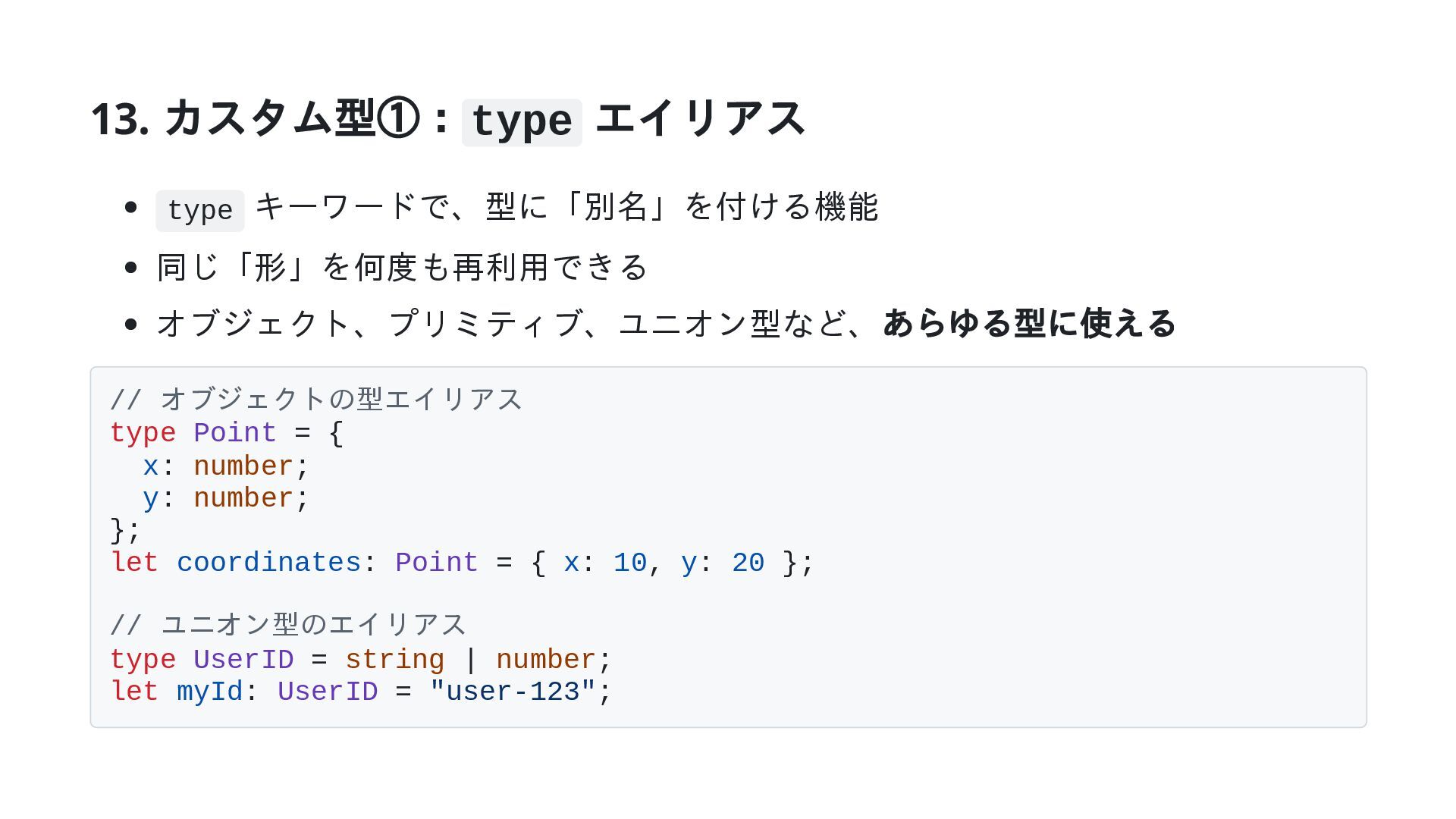 13. カスタム型①:type エイリアス type キーワードで、型に「別名」を付ける機能 同じ「形」を何度も再利用できる オブジェクト、プリミティブ、ユニオン型など、 あらゆる型に使える // オブジェクトの型エイリアス