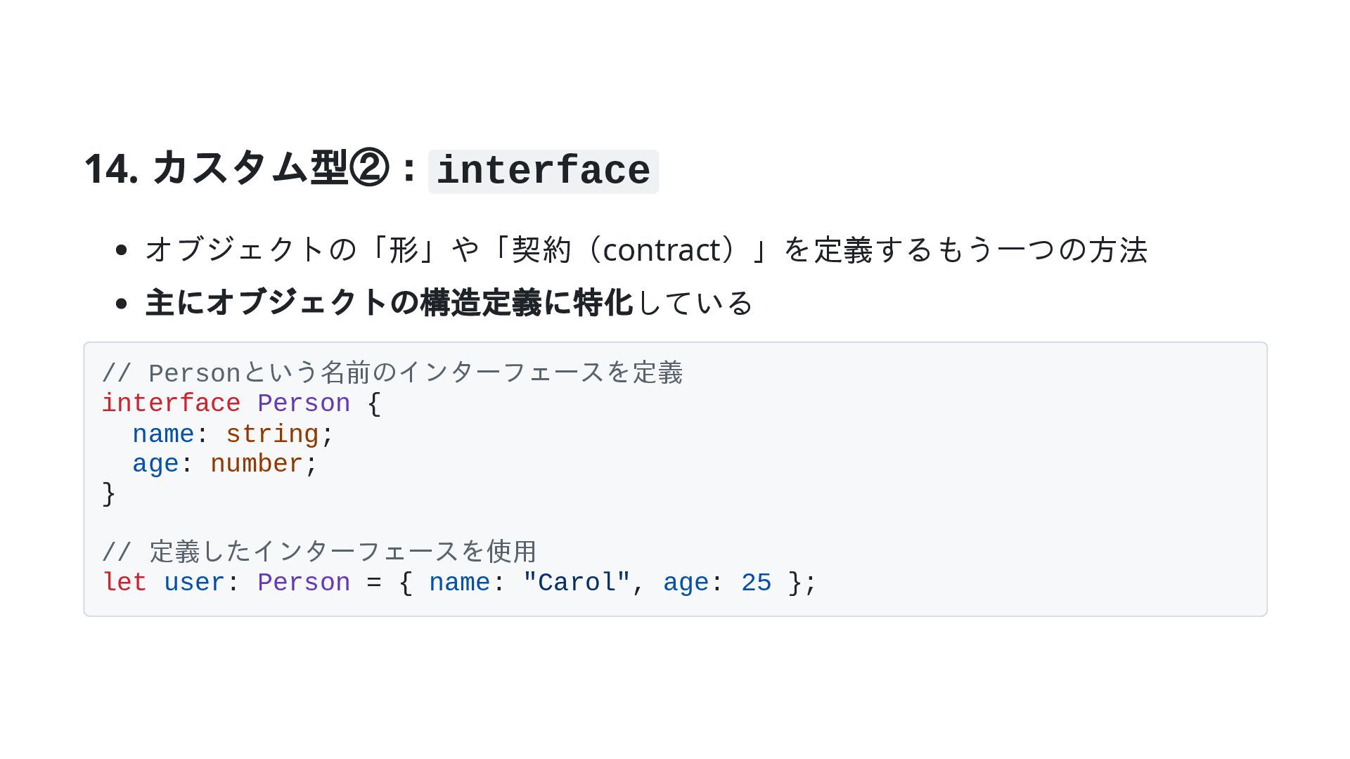 14. カスタム型②:interface オブジェクトの「形」や「契約(contract)」を定義するもう一つの方法 主にオブジェクトの構造定義に特化している // Personという名前のインターフェースを定義 interface Person { name:
