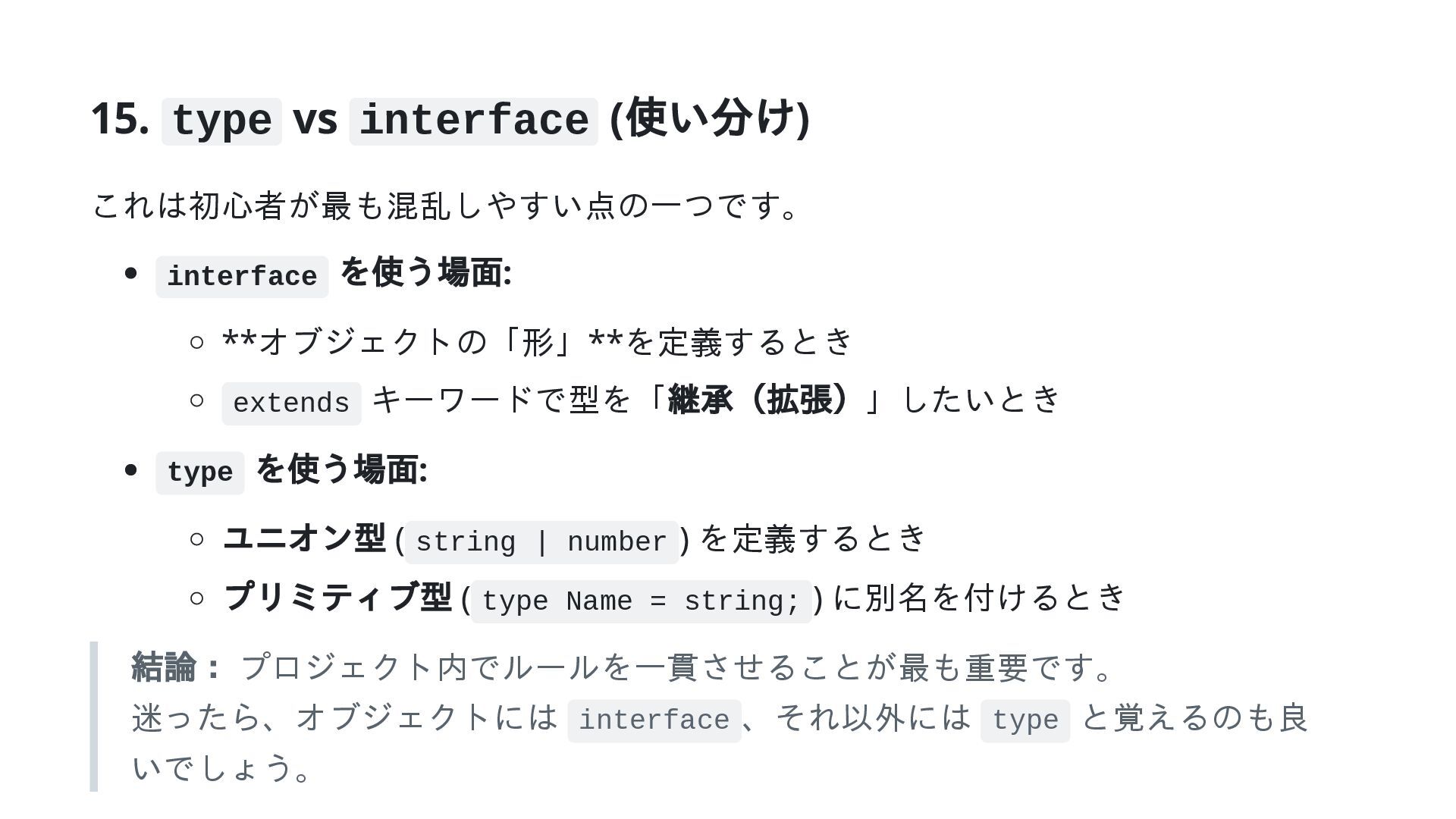 15. type vs interface ( 使い分け) これは初心者が最も混乱しやすい点の一つです。 interface を使う場面: **オブジェクトの「形」**を定義するとき
