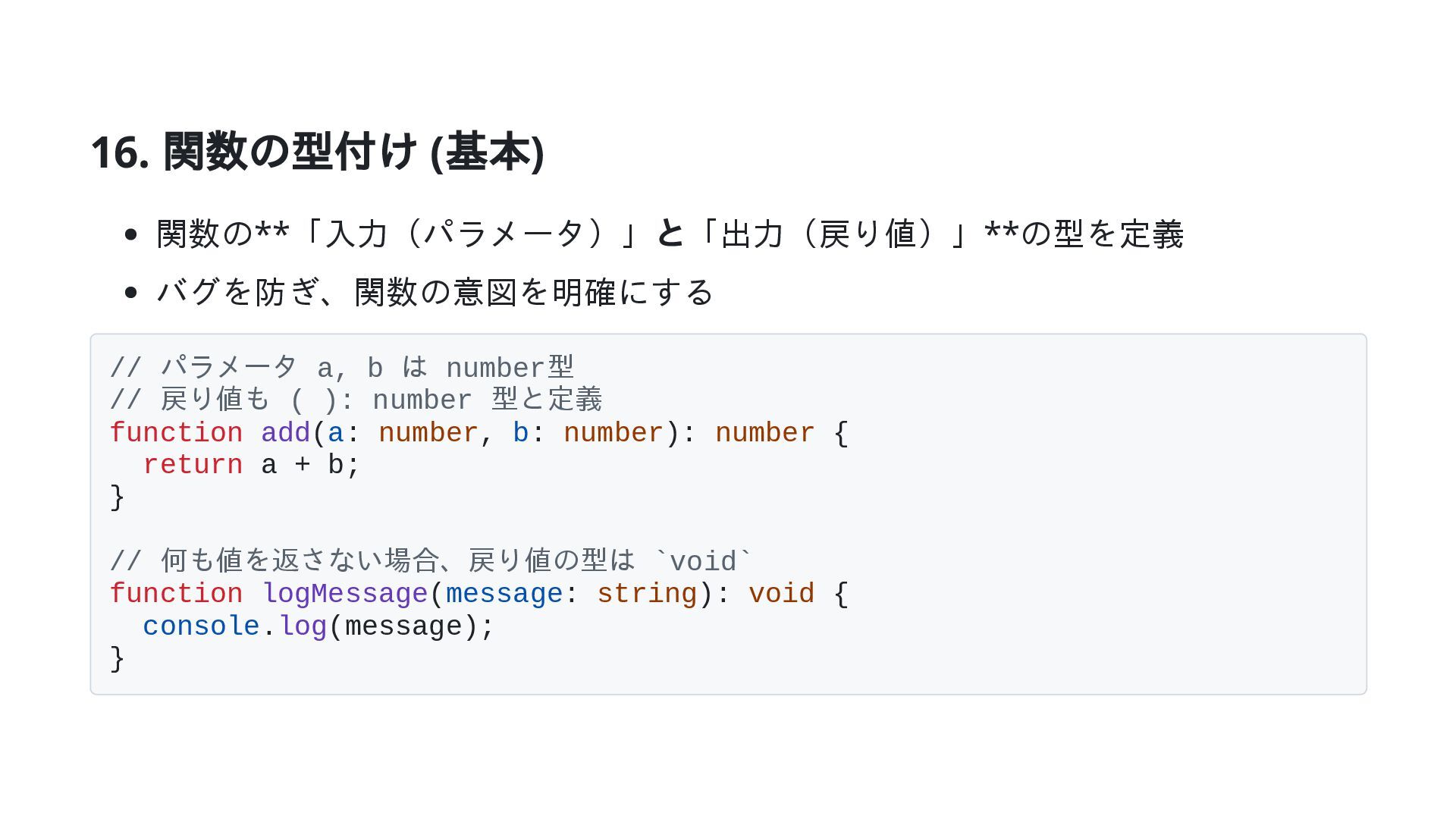 16. 関数の型付け ( 基本) 関数の**「入力(パラメータ)」 と「出力(戻り値)」**の型を定義 バグを防ぎ、関数の意図を明確にする // パラメータ a,