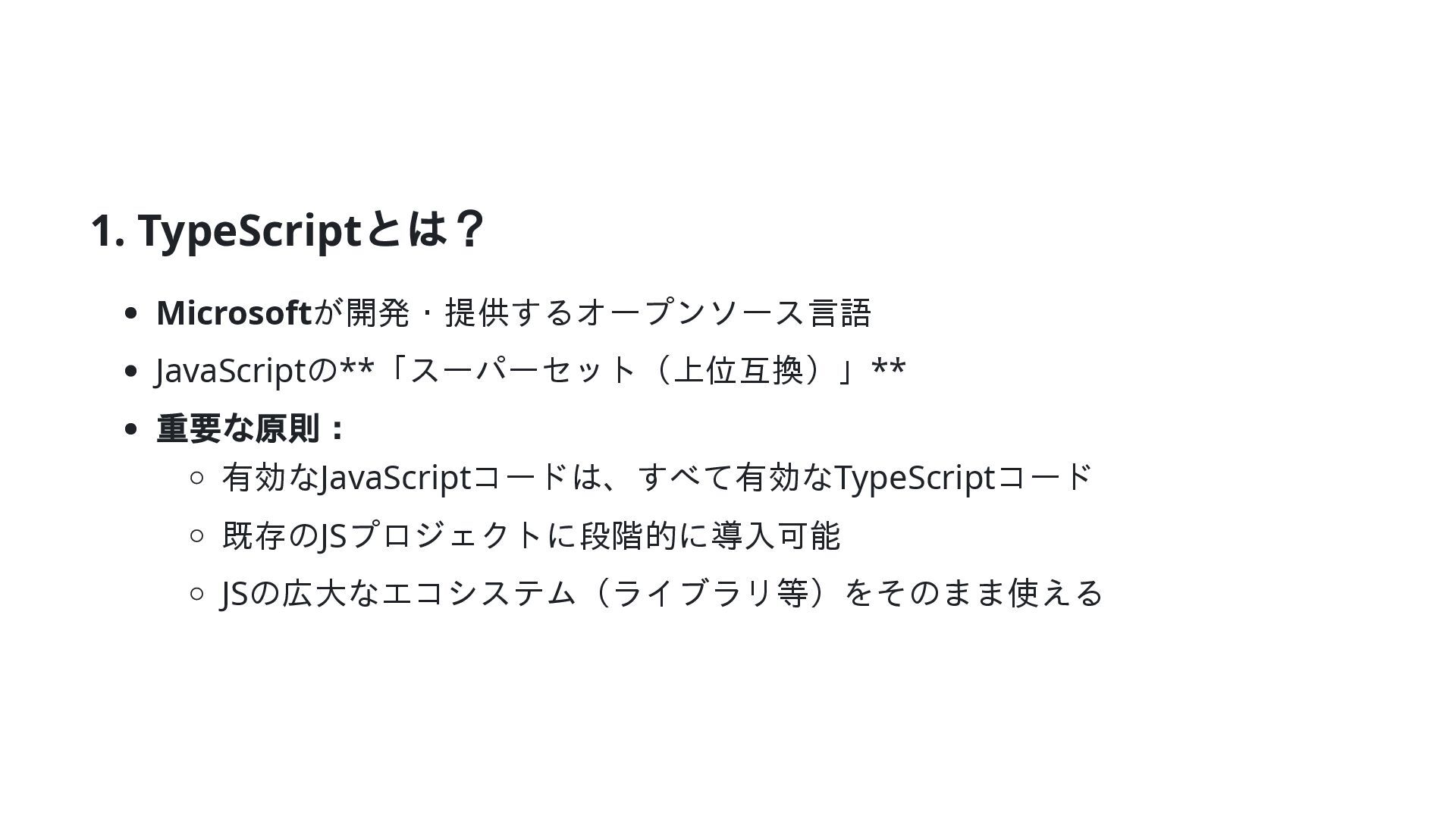1. TypeScript とは? Microsoftが開発・提供するオープンソース言語 JavaScriptの**「スーパーセット(上位互換)」** 重要な原則: 有効なJavaScriptコードは、すべて有効なTypeScriptコード 既存のJSプロジェクトに段階的に導入可能 JSの広大なエコシステム(ライブラリ等)をそのまま使える