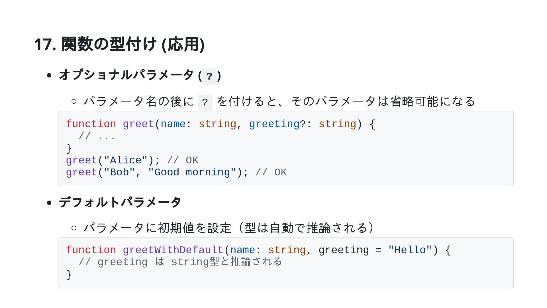 を付けると、そのパラメータは省略可能になる function greet(name: string, greeting?: string) { // ... } greet("Alice"); // OK greet("Bob", "Good morning"); // OK デフォルトパラメータ パラメータに初期値を設定(型は自動で推論される) function greetWithDefault(name: string, greeting = "Hello") { // greeting は string型と推論される }