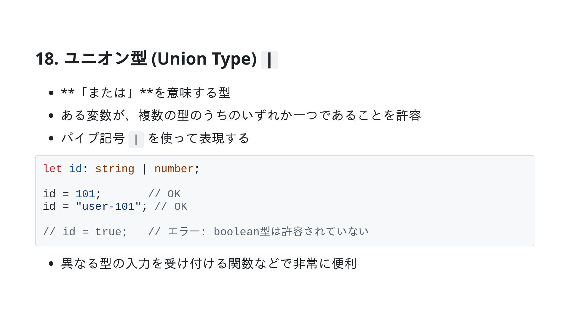 18. ユニオン型 (Union Type) | **「または」**を意味する型 ある変数が、複数の型のうちのいずれか一つであることを許容 パイプ記号 | を使って表現する