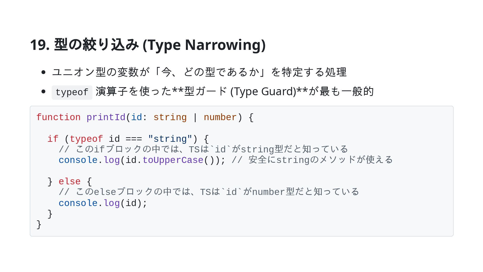 19. 型の絞り込み (Type Narrowing) ユニオン型の変数が「今、どの型であるか」を特定する処理 typeof 演算子を使った**型ガード (Type Guard)**が最も一般的 function