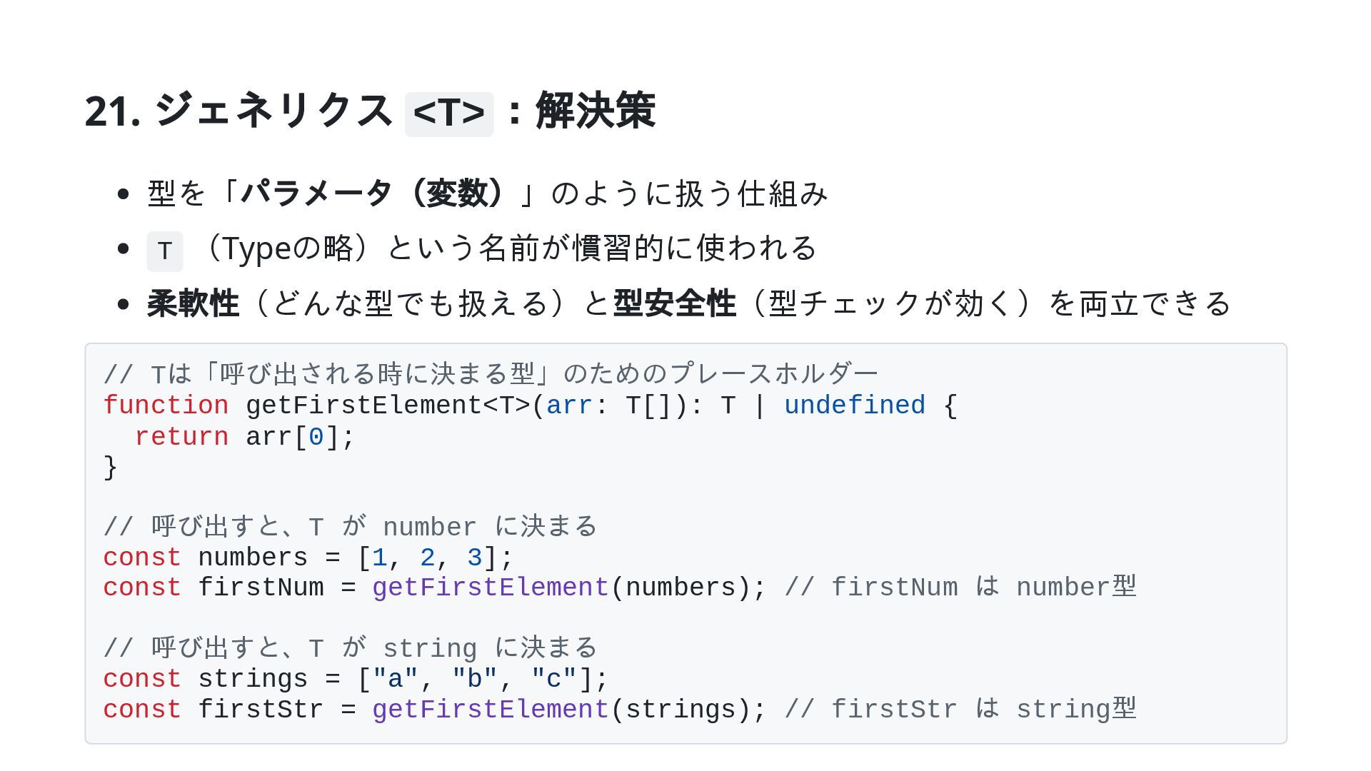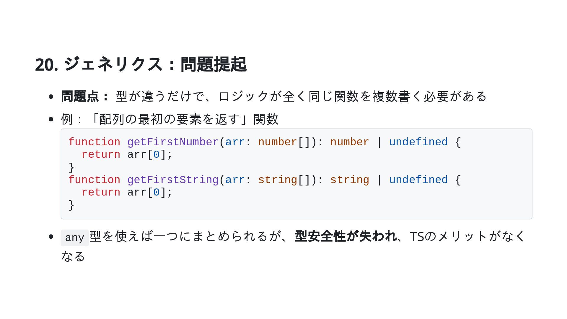 20. ジェネリクス:問題提起 問題点: 型が違うだけで、ロジックが全く同じ関数を複数書く必要がある 例:「配列の最初の要素を返す」関数 function getFirstNumber(arr: number[]): number |