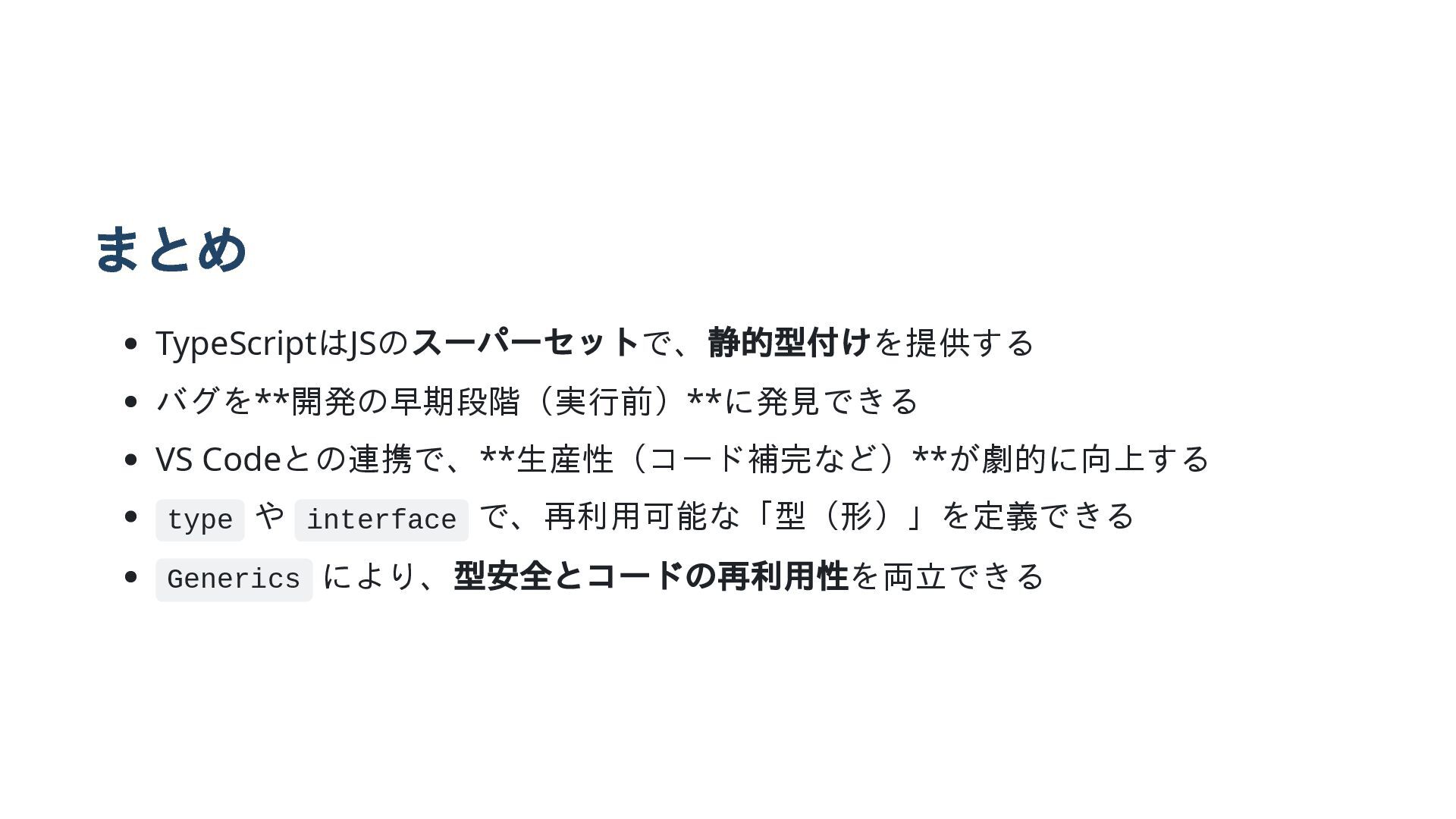 まとめ TypeScriptはJSの スーパーセットで、 静的型付けを提供する バグを**開発の早期段階(実行前)**に発見できる VS Codeとの連携で、**生産性(コード補完など)**が劇的に向上する type や interface