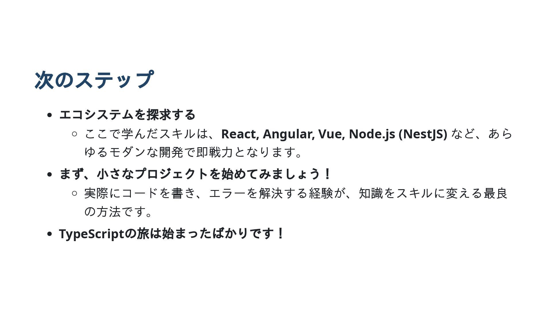 次のステップ エコシステムを探求する ここで学んだスキルは、React, Angular, Vue, Node.js (NestJS) など、あら ゆるモダンな開発で即戦力となります。 まず、小さなプロジェクトを始めてみましょう!