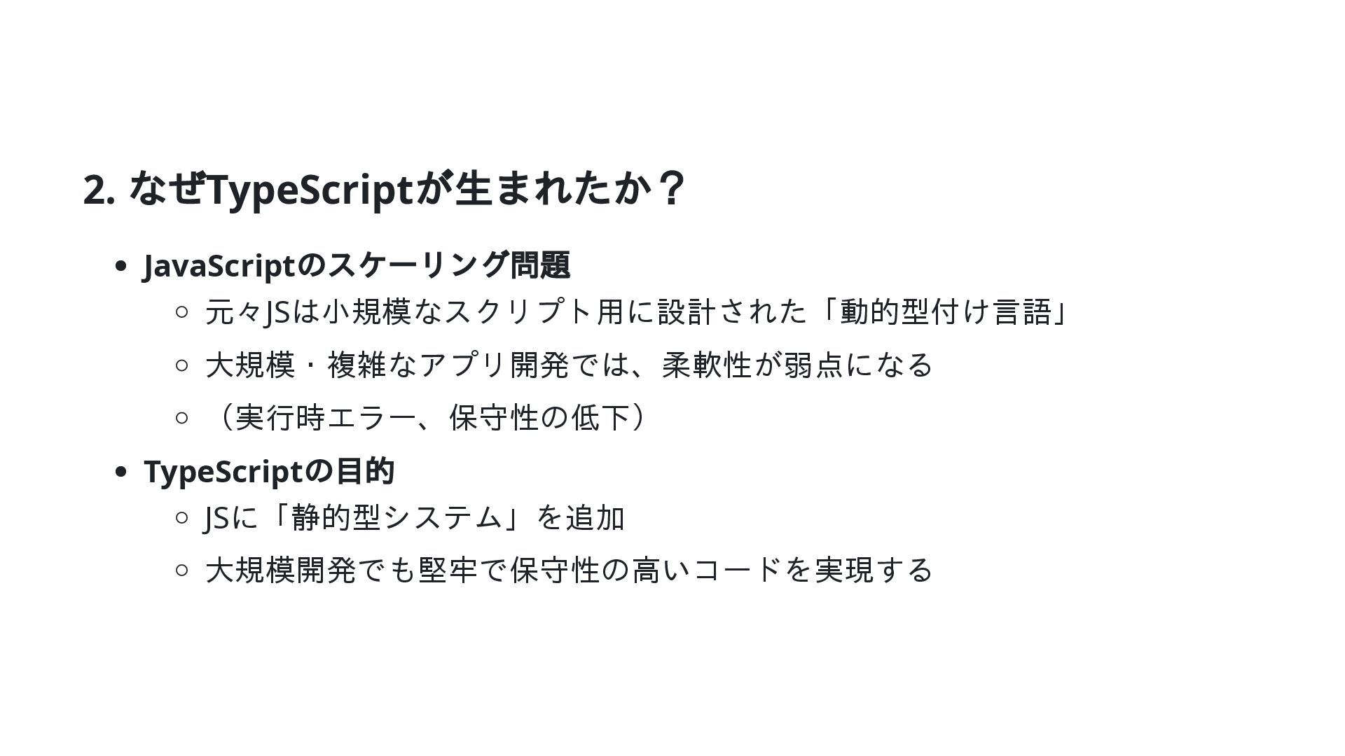 2. なぜTypeScript が生まれたか? JavaScript のスケーリング問題 元々JSは小規模なスクリプト用に設計された「動的型付け言語」 大規模・複雑なアプリ開発では、柔軟性が弱点になる (実行時エラー、保守性の低下) TypeScript の目的