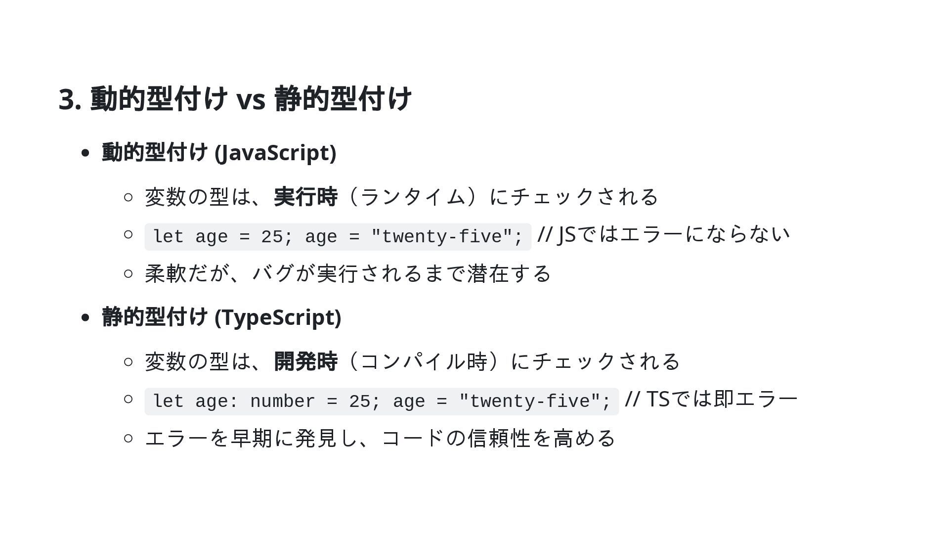 3. 動的型付け vs 静的型付け 動的型付け (JavaScript) 変数の型は、 実行時(ランタイム)にチェックされる let age