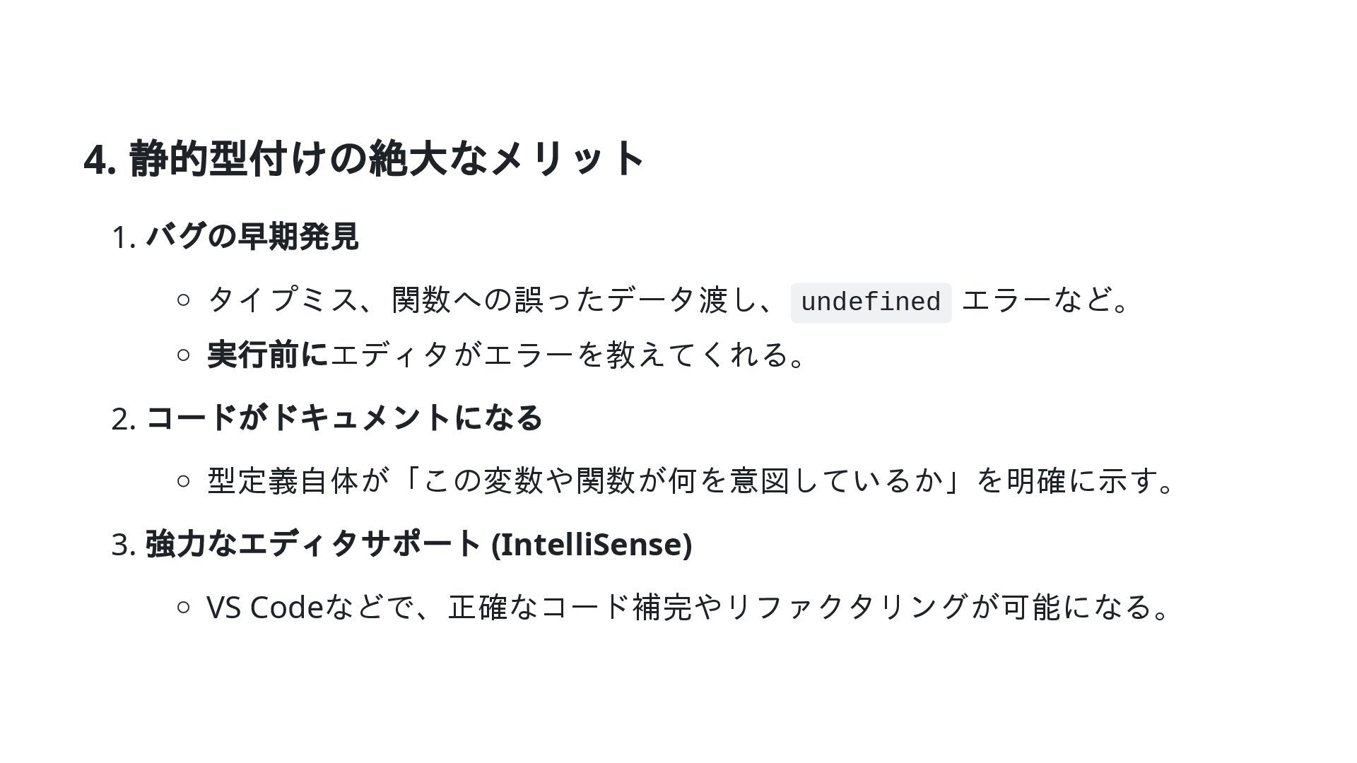 型定義自体が「この変数や関数が何を意図しているか」を明確に示す。 3. 強力なエディタサポート (IntelliSense) VS Codeなどで、正確なコード補完やリファクタリングが可能になる。